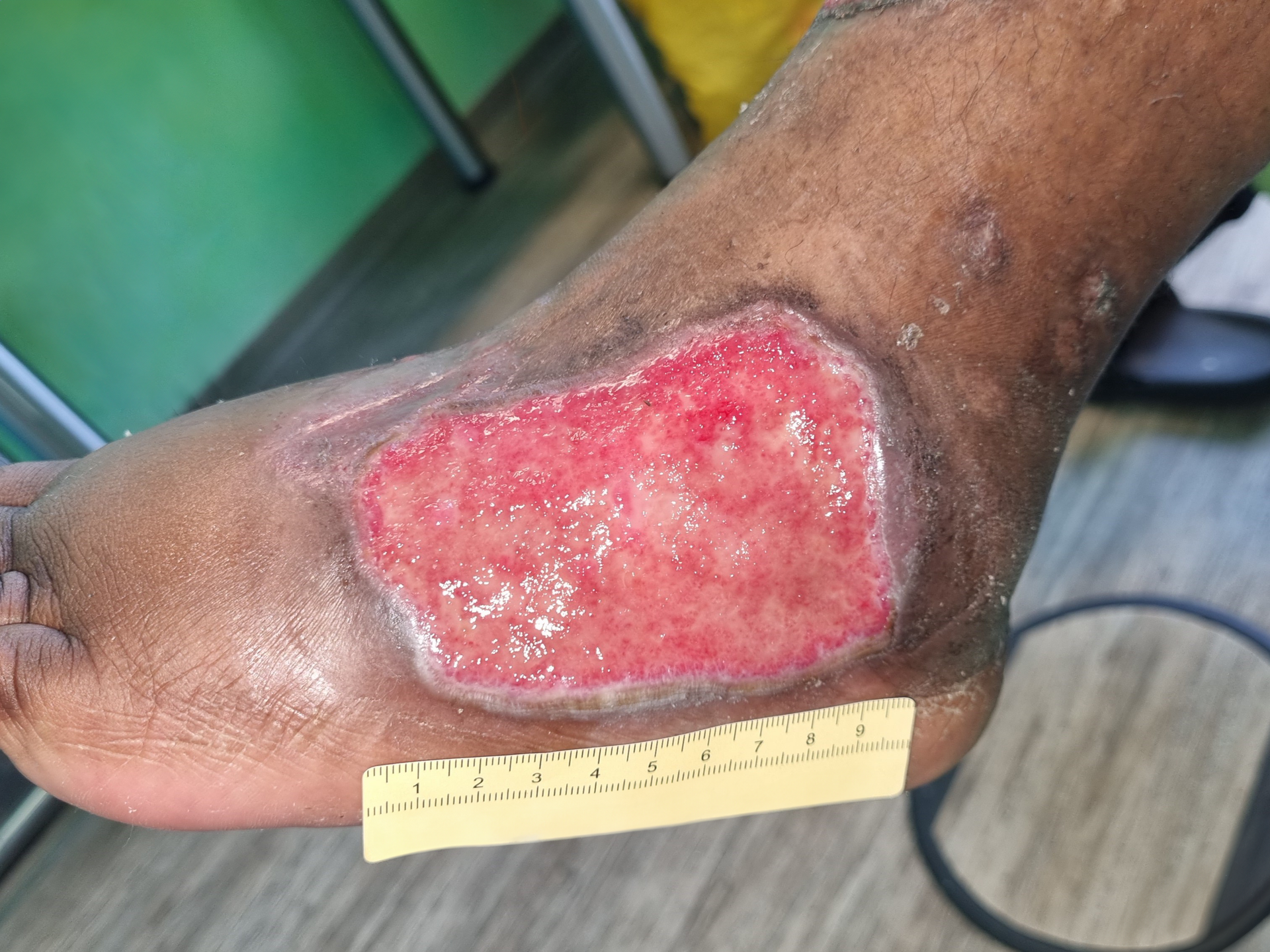 Bei Erstvorstellung in der spezialisierten Praxis zeigt sich ein 9 cm langes, 7,2 cm breites und 0,3 cm tiefes Ulcus am linken Fuß lateral (Foto 1). Es finden sich zudem medial und ventral jeweils zwei Ulzerationen am Unterschenkel (Fotos 2 und 3) sowie einige weitere, kleinere Wunden am Bein.