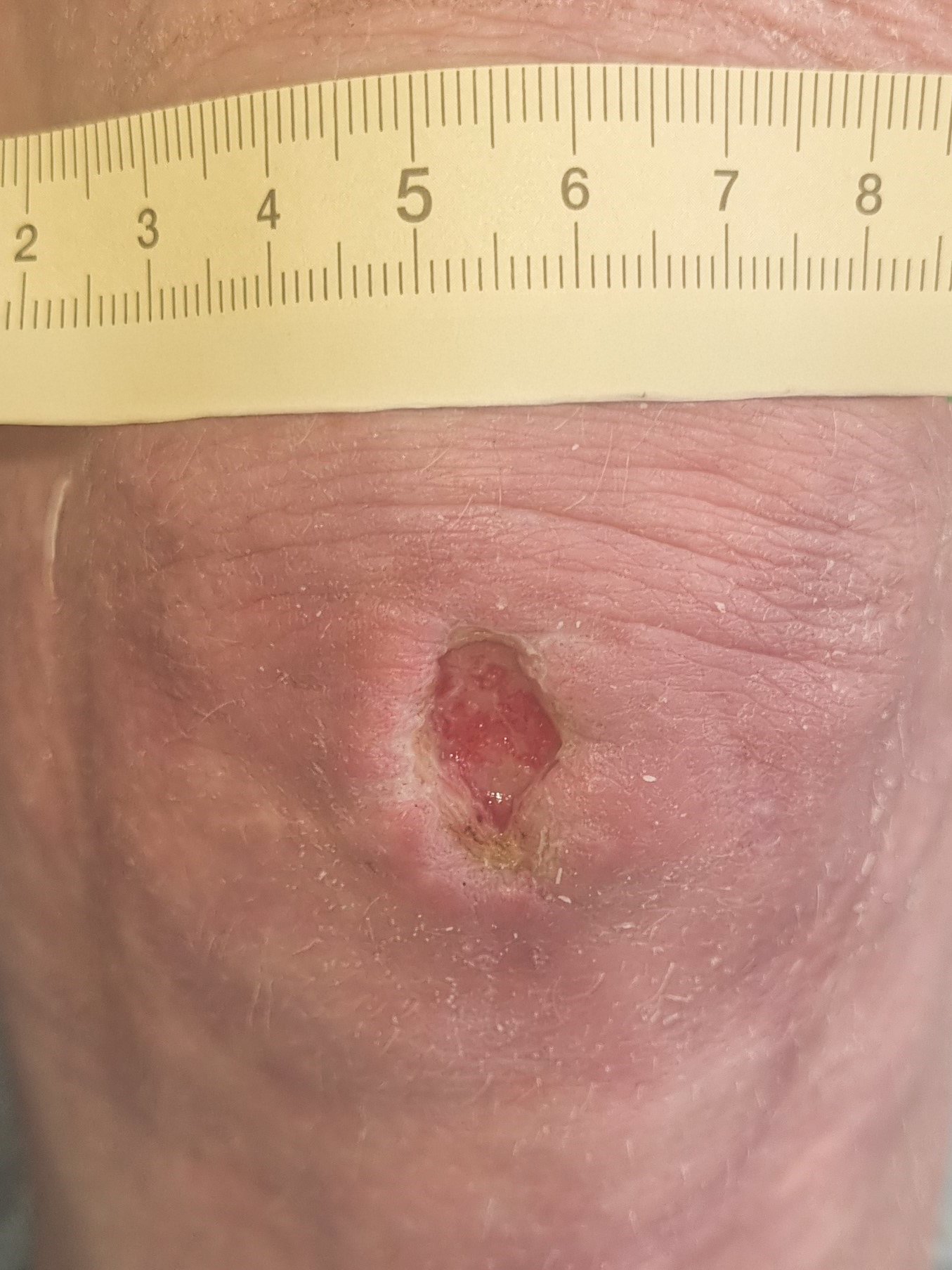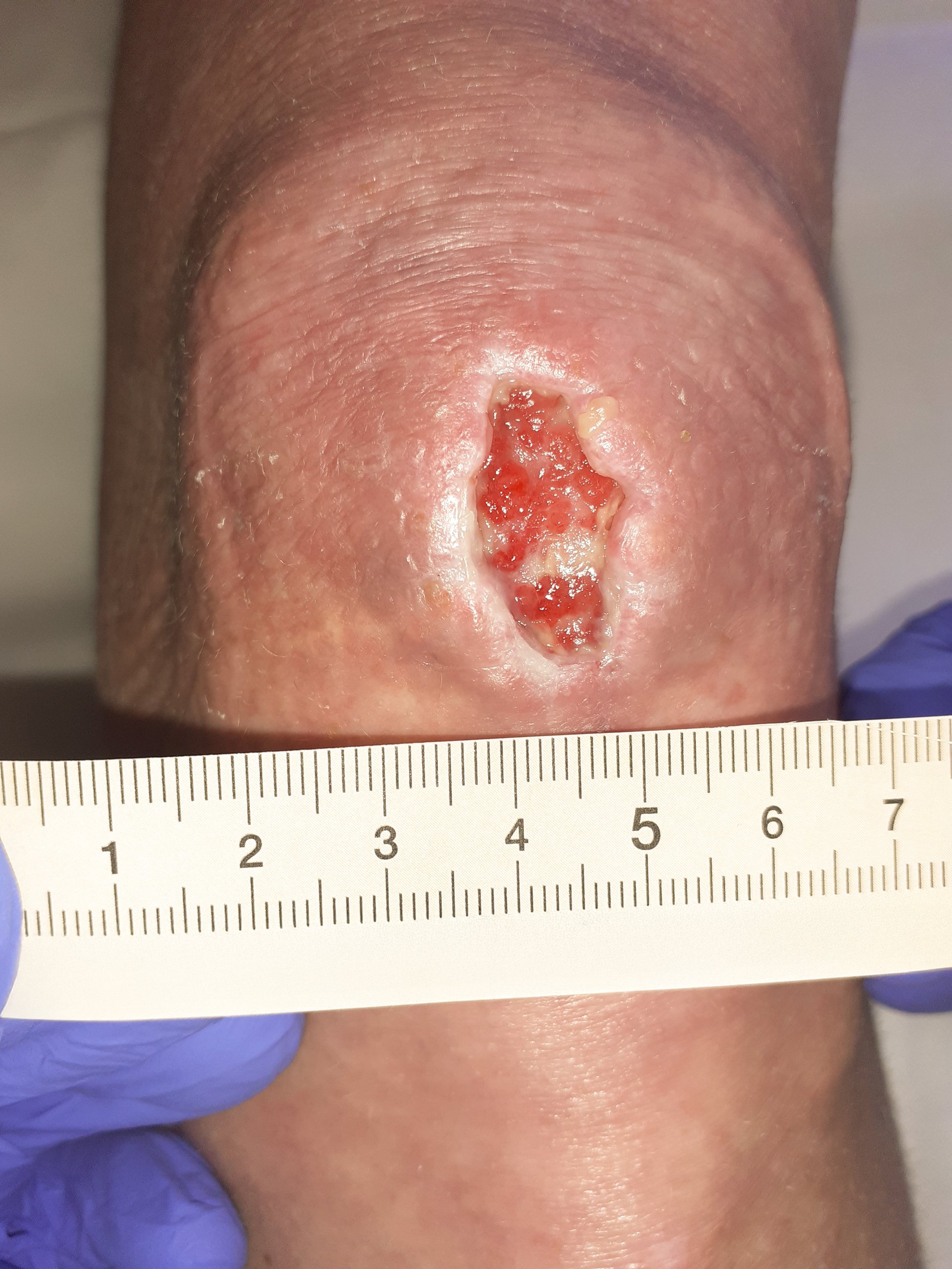 Die Wunde an der linken Patella ist ursprünglich 2,2 cm lang, 1,1 cm breit und 4 mm tief (Foto 1). Der Wundgrund weist Granulationsgewebe und Fibrinbelag auf, während der Wundrand mazeriert ist. Die Wundumgebung ist leicht gerötet. Die Umgebungshaut ist sehr trocken und empfindlich und es sind keine Ödeme vorhanden. Es liegt eine mäßige, schleimig-gelbliche Exsudation vor. Außerdem gibt Frau S. leichte Schmerzen (VAS (Visuelle Analogskala) 2, während der Wundreinigung VAS 3) an, die sie jedoch als gut aushaltbar beschreibt.
