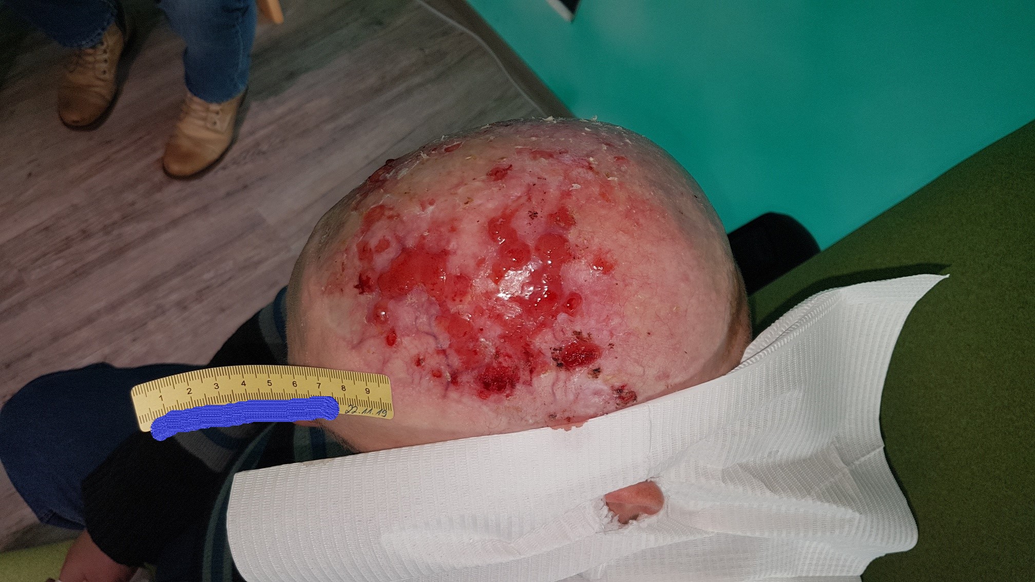 Herr B. stellte sich im November 2019 auf Anraten seines Dermatologen erstmals in einer spezialisierten pflegerischen Einrichtung vor. Damals war vor allem die linke Schädelhälfte betroffen, an der multiple Ulzerationen zu einer Wundfläche von etwa 10 cm Länge und 8 cm Breite zusammenliefen (Foto 1). Weitere kleine Ulzerationen fanden sich im gesamten Schädelbereich. Die Wunden waren alle oberflächlich, sauber und sonderten viel klares, seröses und geruchloses Exsudat ab. Von den unauffälligen Wundrändern aus war an vielen Stellen Epithelisierung erkennbar. Die Wundumgebung und die Umgebungshaut waren trocken und an einigen Stellen schorfig. Schmerzen hatte Herr B. zu diesem Zeitpunkt nicht.