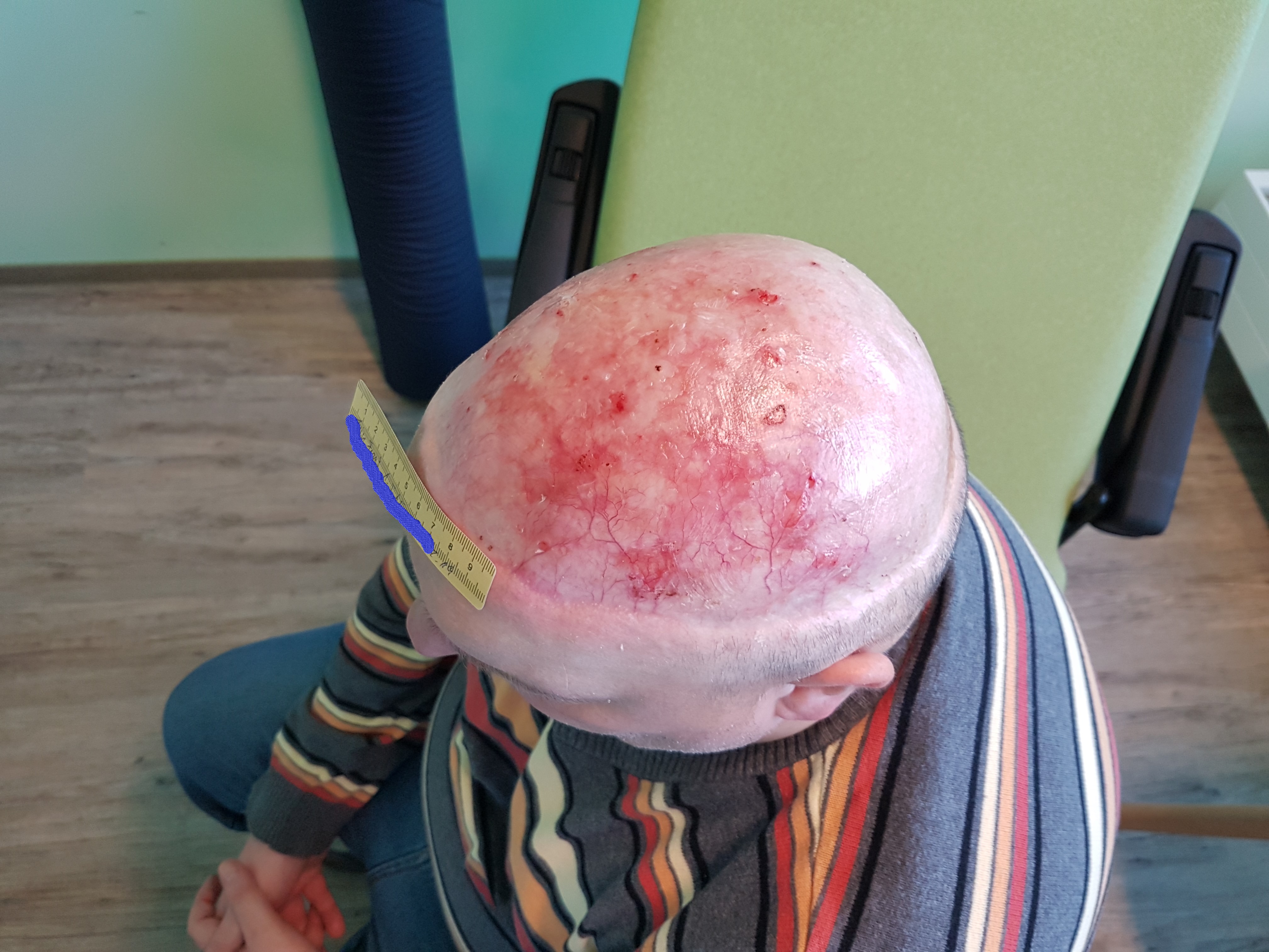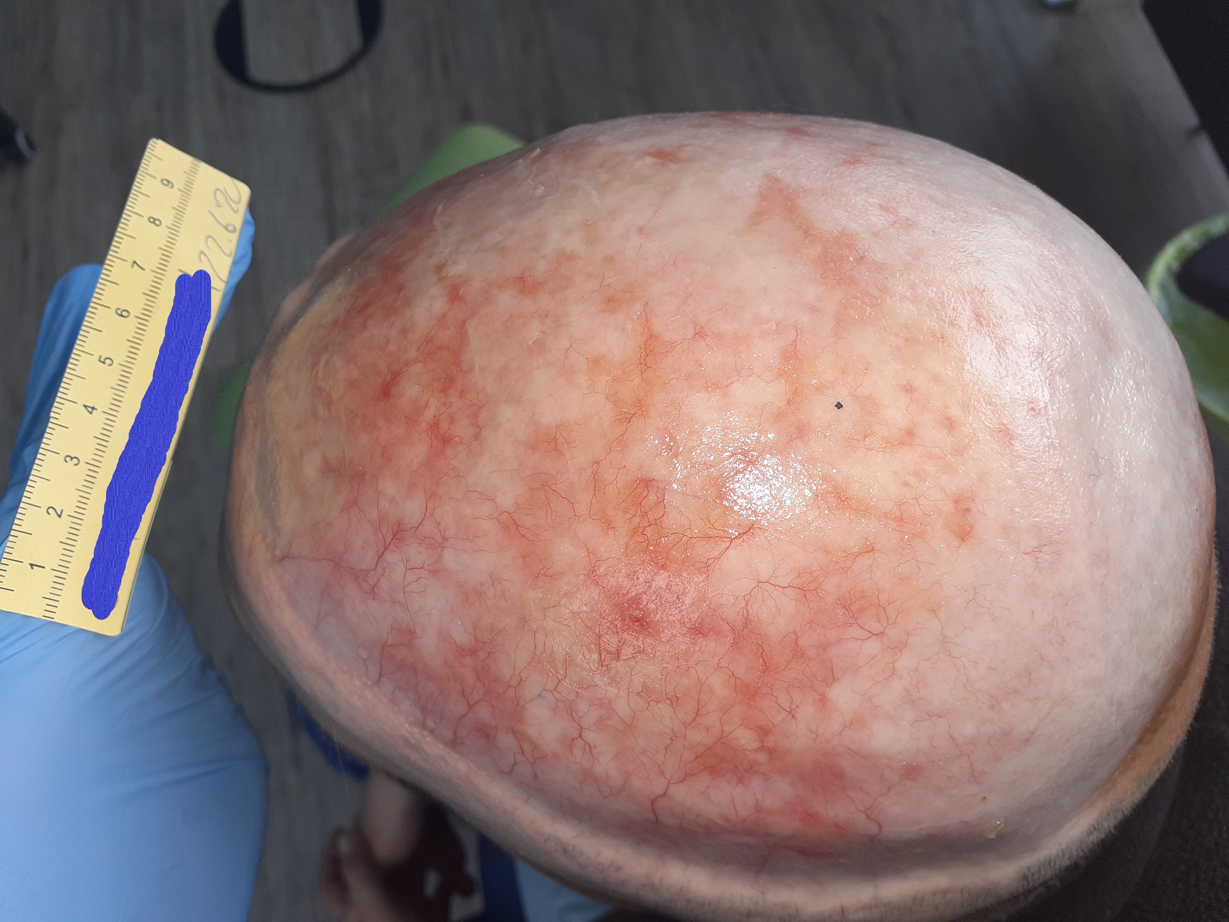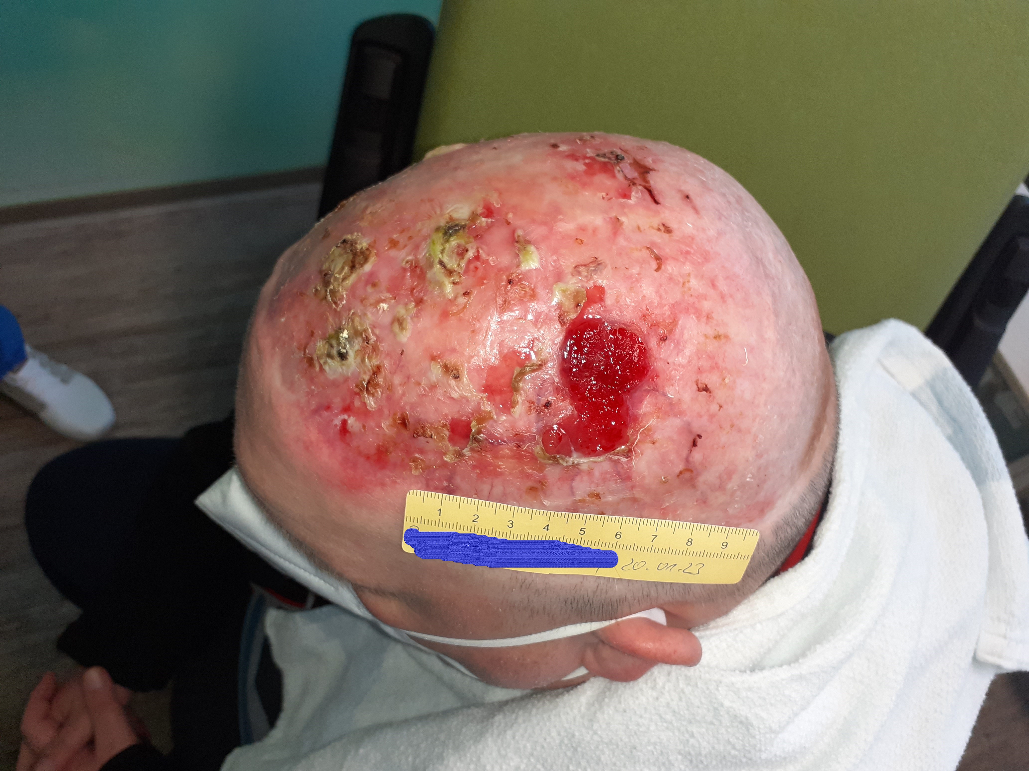 Im April 2020 verschlechterte sich die Wundsituation deutlich. Es war eine Wunde von 6,5 cm Länge und 5 cm Breite zu sehen (Foto 3). Der Wundgrund wies sauberes Granulationsgewebe auf, der Wundrand war großteils intakt und an einigen Stellen lederte sich entstandenes Epithelgewebe ab. Das wenige Exsudat war klar und geruchlos. Auch an anderen Stellen des Schädels waren kleinere Ulzerationen erkennbar. Nach dem Gespräch mit Herrn B. und Konsultation mit dem Dermatologen wurde zum einen vermutet, dass die Hautsituation bei Herrn B. aufgrund der Vorschädigung inzwischen so fragil war, dass durch die Versorgung mit sterilen Kompressen über dem Silikondistanzgitter oder auch bei den nicht abgedeckten Stellen durch Unebenheiten in der Kopfbedeckung Scherkräfte entstanden, die die Haut verletzten. Zum anderen trug Herr B. inzwischen keine Mütze mehr, sondern ein Basecap, an dem sich auch festere Kanten befanden.