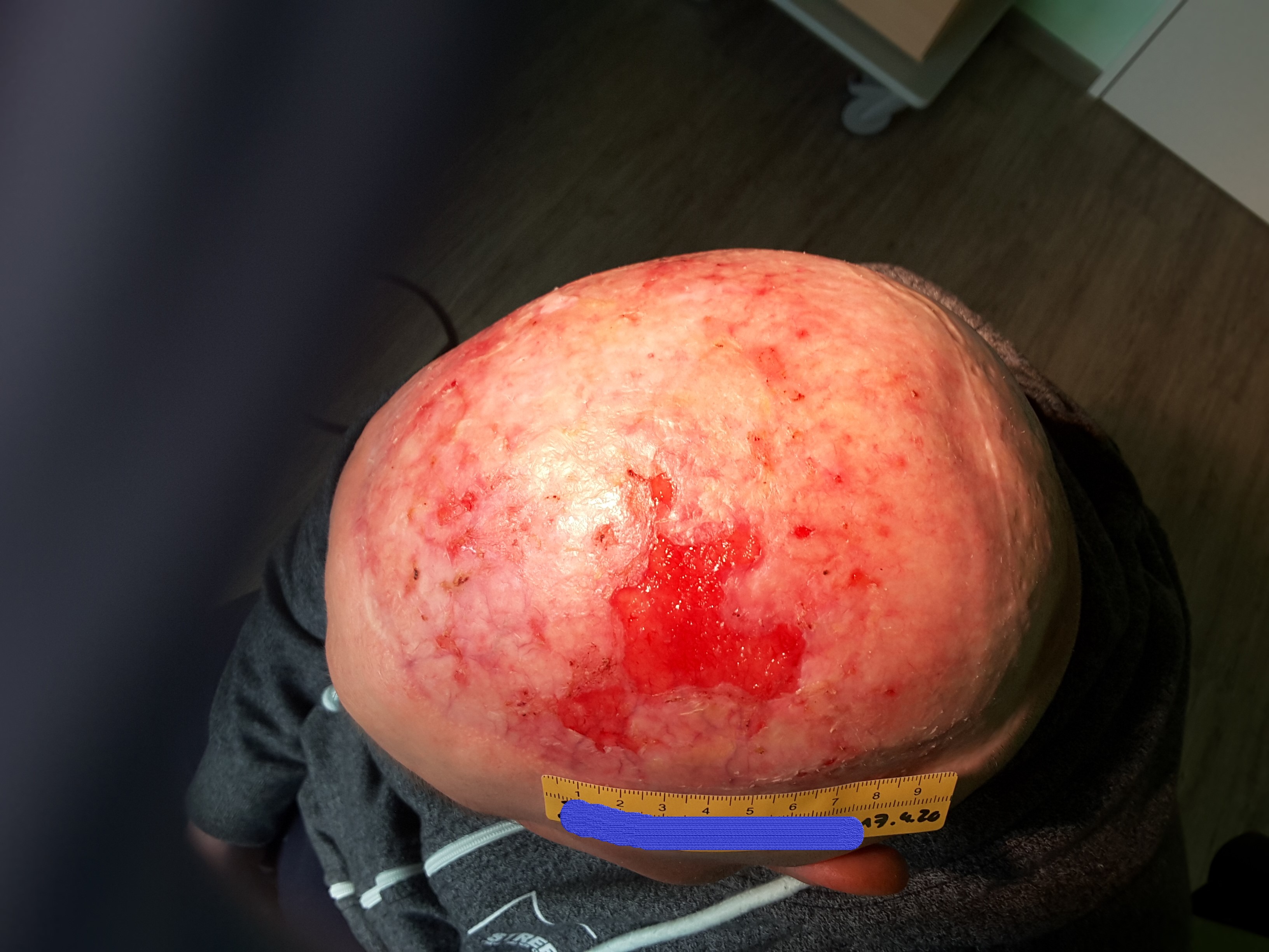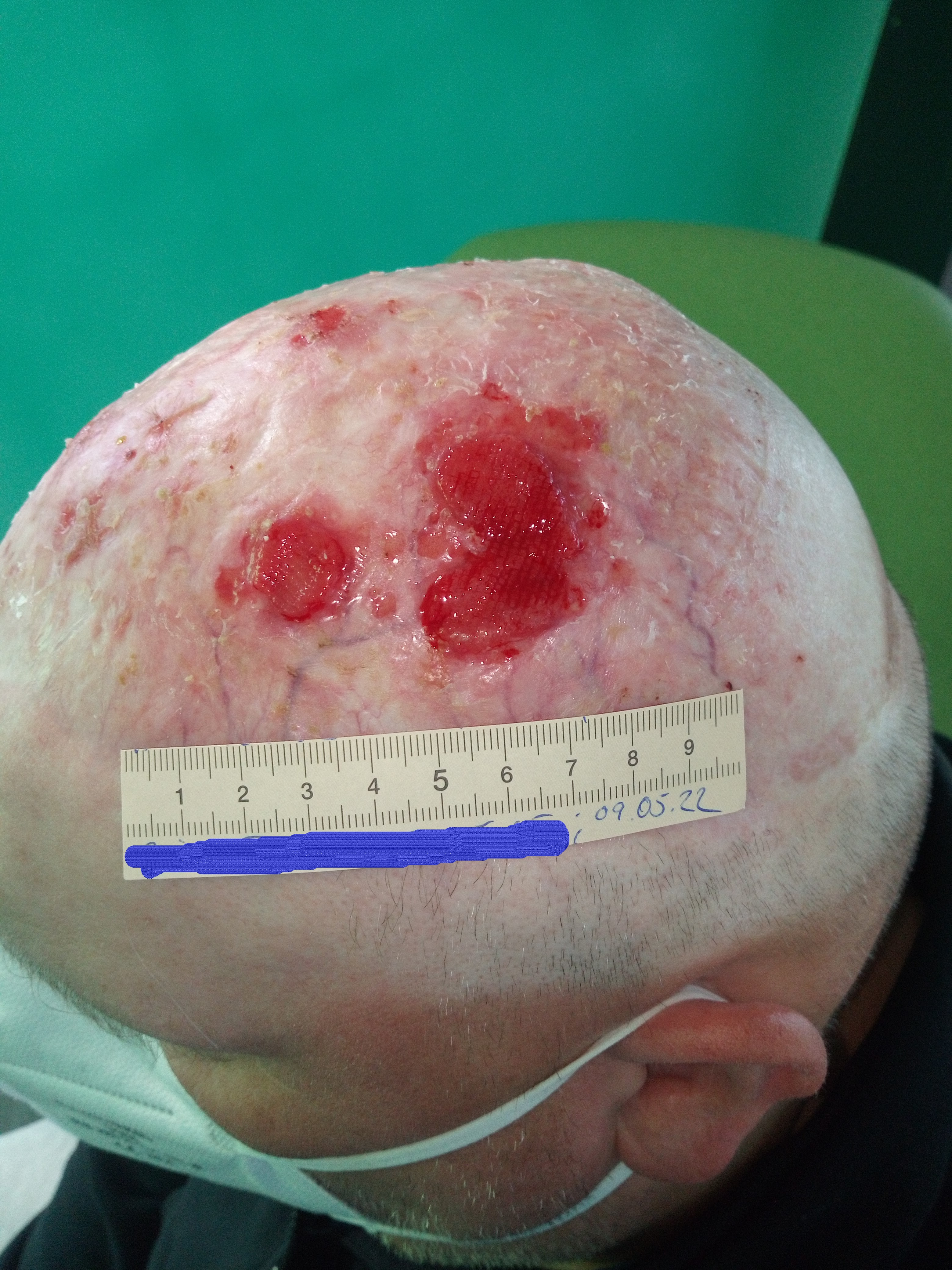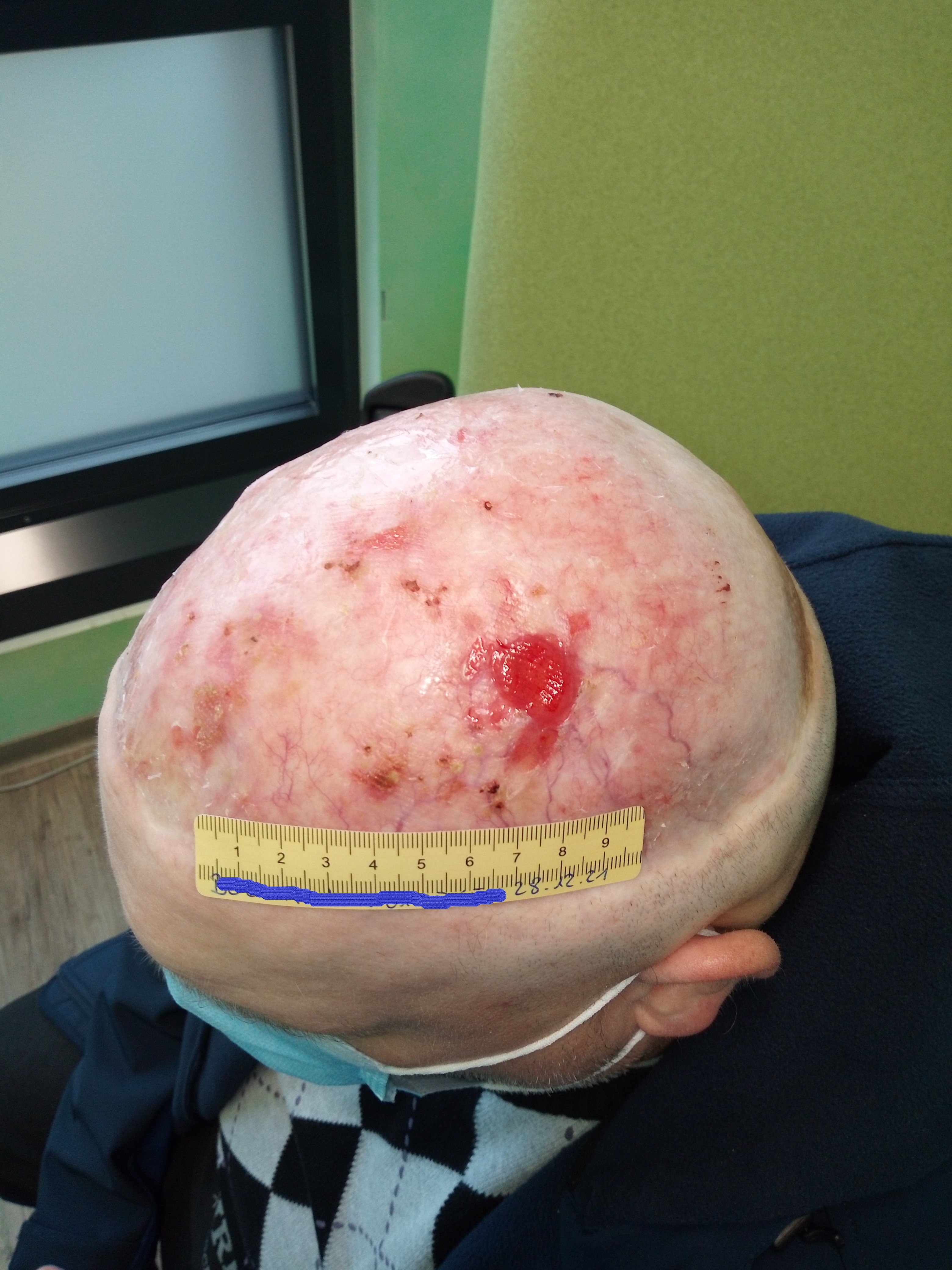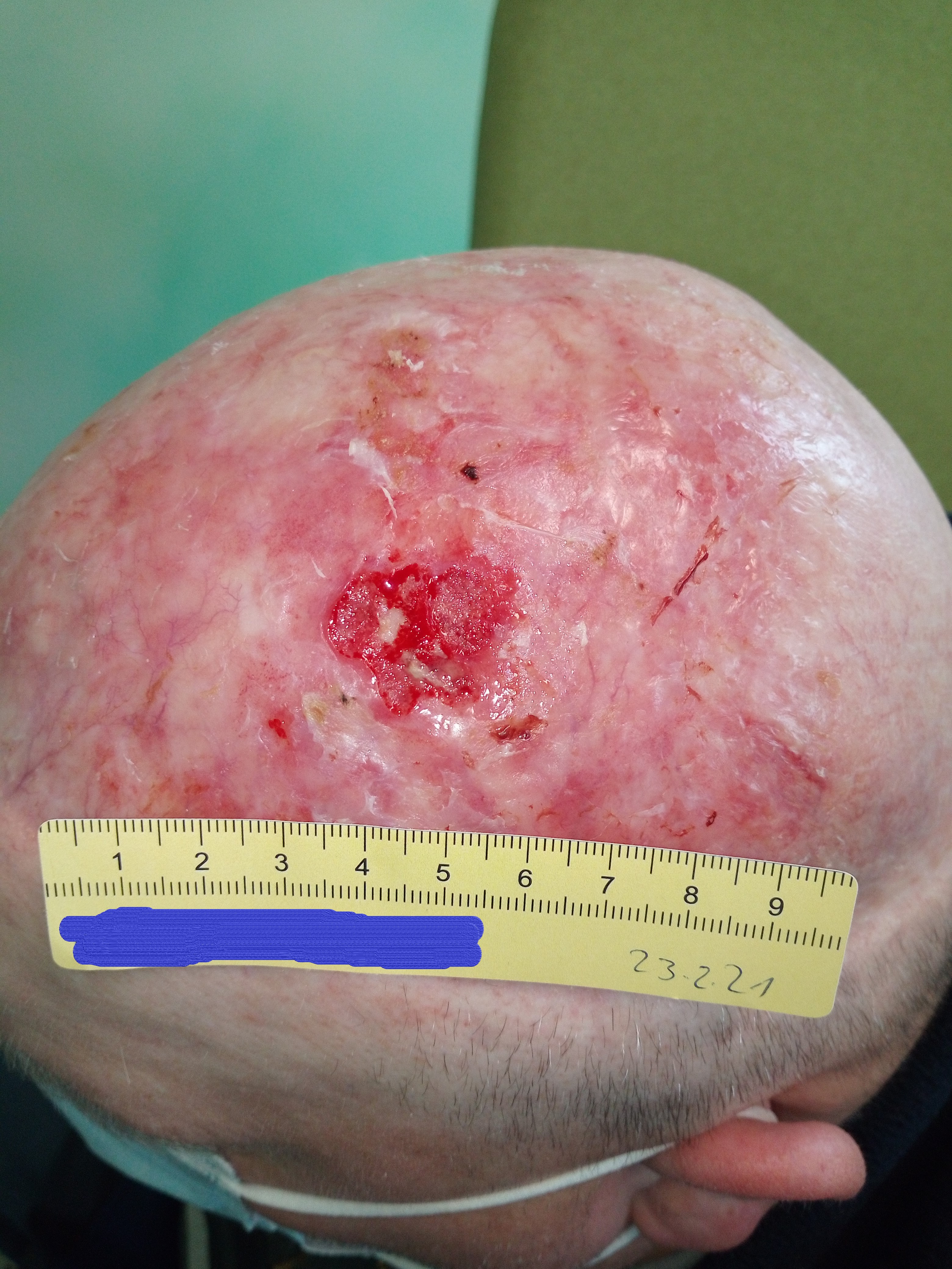 Im April 2020 verschlechterte sich die Wundsituation deutlich. Es war eine Wunde von 6,5 cm Länge und 5 cm Breite zu sehen (Foto 3). Der Wundgrund wies sauberes Granulationsgewebe auf, der Wundrand war großteils intakt und an einigen Stellen lederte sich entstandenes Epithelgewebe ab. Das wenige Exsudat war klar und geruchlos. Auch an anderen Stellen des Schädels waren kleinere Ulzerationen erkennbar. Nach dem Gespräch mit Herrn B. und Konsultation mit dem Dermatologen wurde zum einen vermutet, dass die Hautsituation bei Herrn B. aufgrund der Vorschädigung inzwischen so fragil war, dass durch die Versorgung mit sterilen Kompressen über dem Silikondistanzgitter oder auch bei den nicht abgedeckten Stellen durch Unebenheiten in der Kopfbedeckung Scherkräfte entstanden, die die Haut verletzten. Zum anderen trug Herr B. inzwischen keine Mütze mehr, sondern ein Basecap, an dem sich auch festere Kanten befanden.