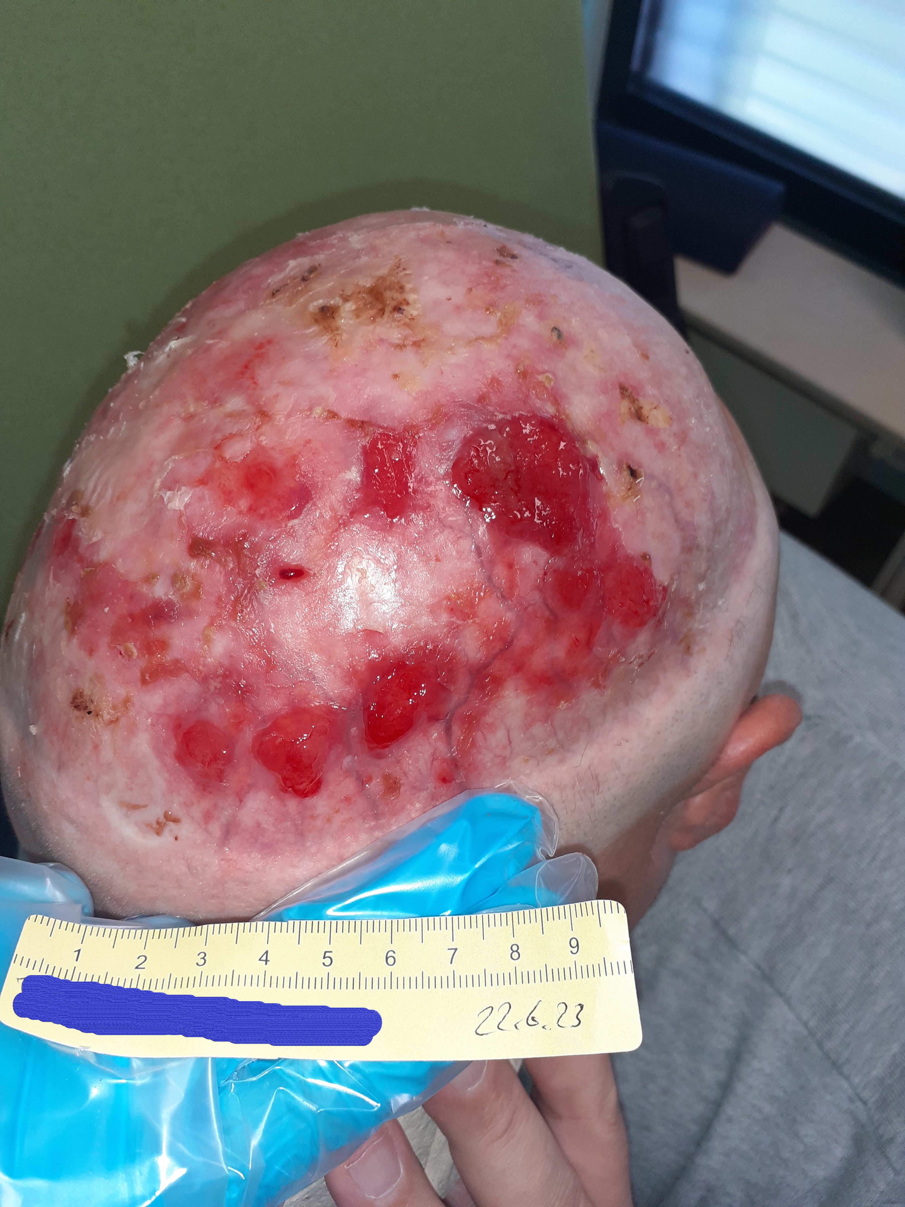 Aktuell (Stand Juni 2023) ist die Wundfläche zwar immer noch recht groß, aber es zeigen sich überall sauberes Granulationsgewebe und intakte Wundränder (Foto 9). Aufgrund der vorhandenen Exsudation der Wunde Richtung Hinterkopf wird dort weiterhin ein PU-Schaum eingesetzt. Die Wunden im Stirnbereich werden mit Silikondistanzgitter und Vlieskompressen versorgt. Das Versorgungsintervall ist auf alle 3 Tage festgesetzt. Herr B. muss unbedingt weiterhin regelmäßig die Hautpflege durchführen und darauf achten, sehr weiche Kopfbedeckungen zu tragen. Der Kontakt zu seinem Bruder mit Familie hat sich in den letzten Wochen intensiviert, was Herrn B. zu motivieren scheint. Er nimmt auch seine Kontrolltermine beim Dermatologen und Onkologen zuverlässig wahr und hofft darauf, dass sich die Wundsituation im Verlauf zumindest wieder so stabilisiert, dass er möglichst selten verbunden werden muss.