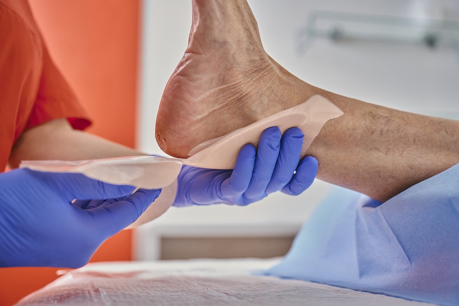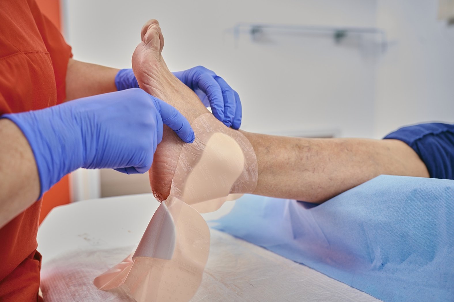 Mittlere Schutzfolie entfernen, Wundauflage mittig an der Ferse platzieren, gerade Schaumstoffkante zur Fußspitze