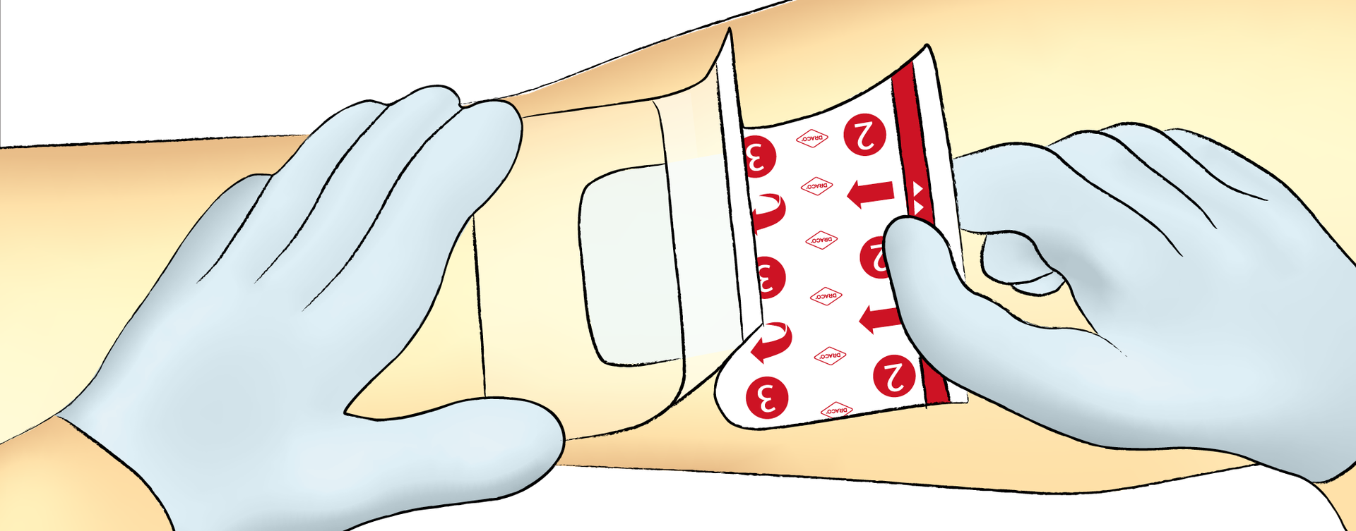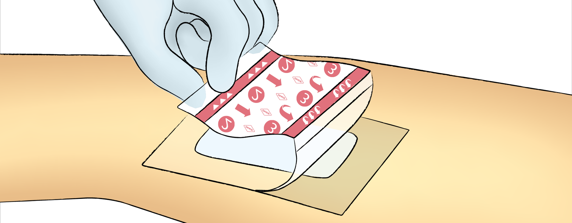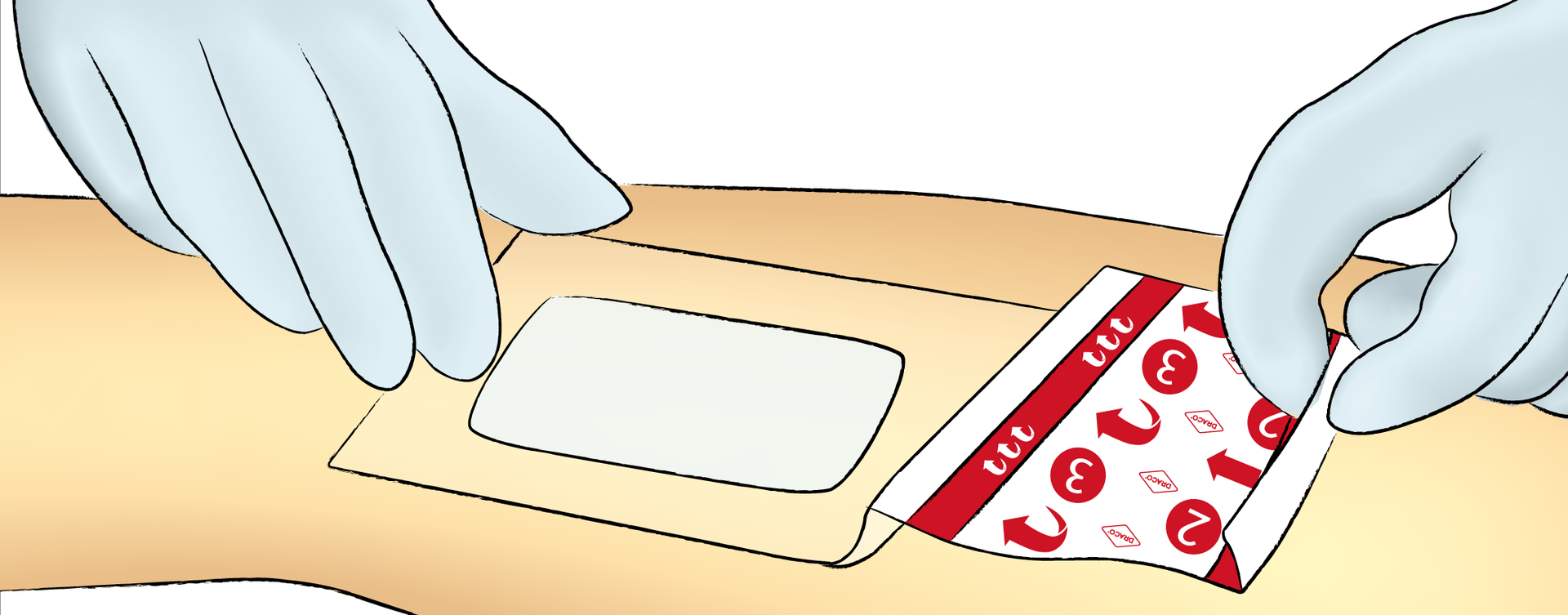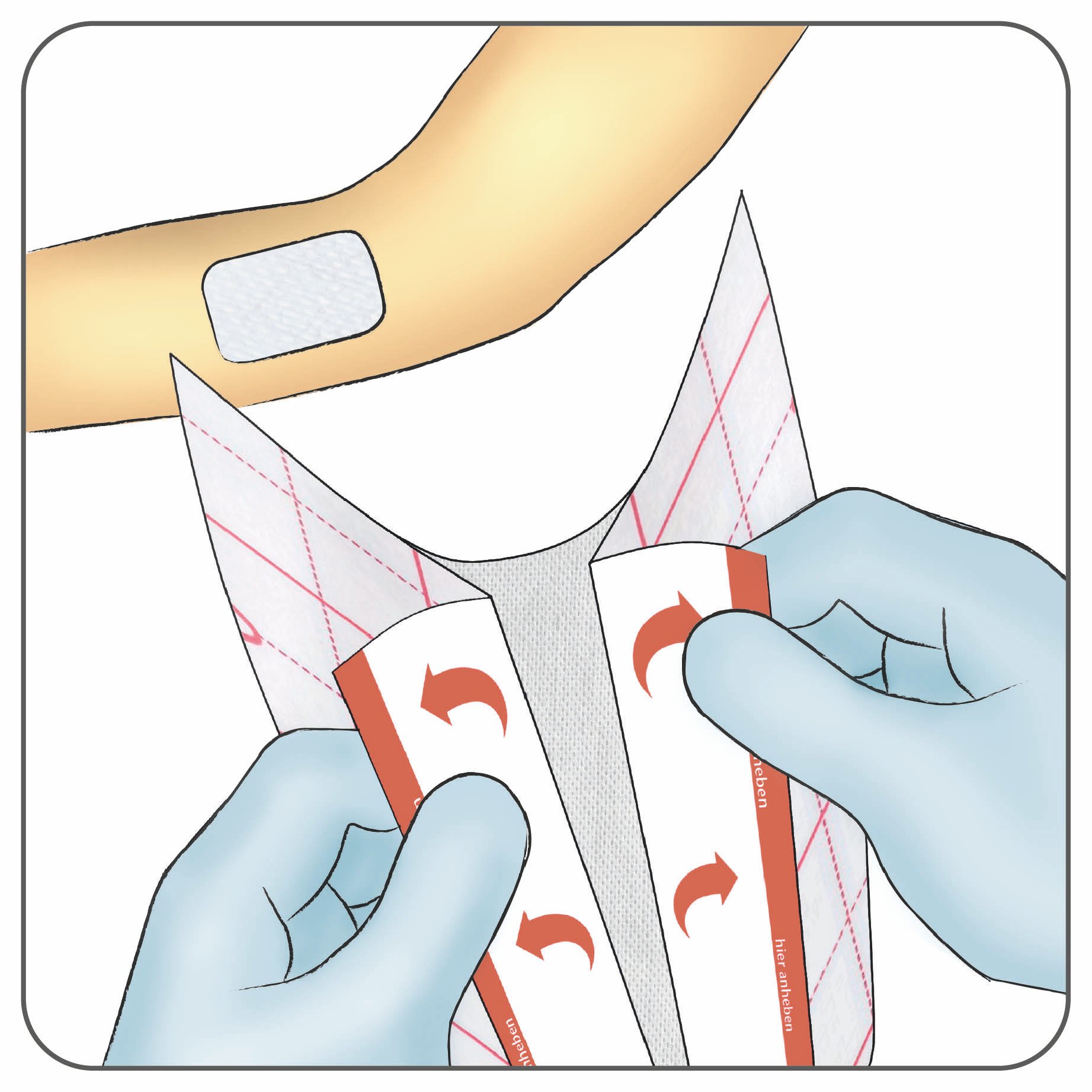- klebenden Teil der Folie so auf Haut und Wundauflage platzieren, dass etwa die Hälfte der Wundauflage abgedeckt und auf der Haut fixiert wird