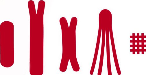 - Y-/V-Tape: Das Tape wird auf die gewünschte Länge gekürzt und in Längsrichtung in der Mitte geteilt und eine Basis stehen gelassen. Je nach Längenverhältnis von Schenkel und Basis gleicht die Form des Tapes einem „Y“ oder „V“.
