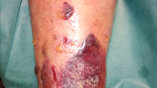 Herr P. wurde vorstellig mit massiver Blasenbildung bei Wunden am Unterschenkel, einem Ulcus cruris venosum, stark exsudierend bei bekannter CVI. Ursache hierfür war ein verrutschter Kompressionsverband, der zunächst erst kleinere Verletzungen verursachte.