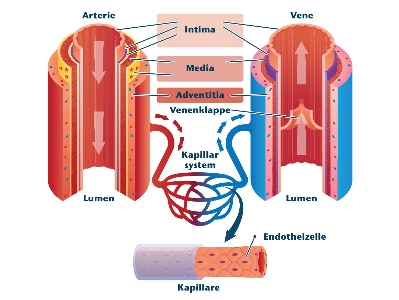 | Funktion Blutgefäße | Bluttransport vom Herzen weg in das Gewebe | Bluttransport aus dem Gewebe zum Herzen hin; Speicherfunktion von Blut | Bindeglied zwischen Arterien und Venen, Vermittlung des Gas- und Stoffaustauschs |