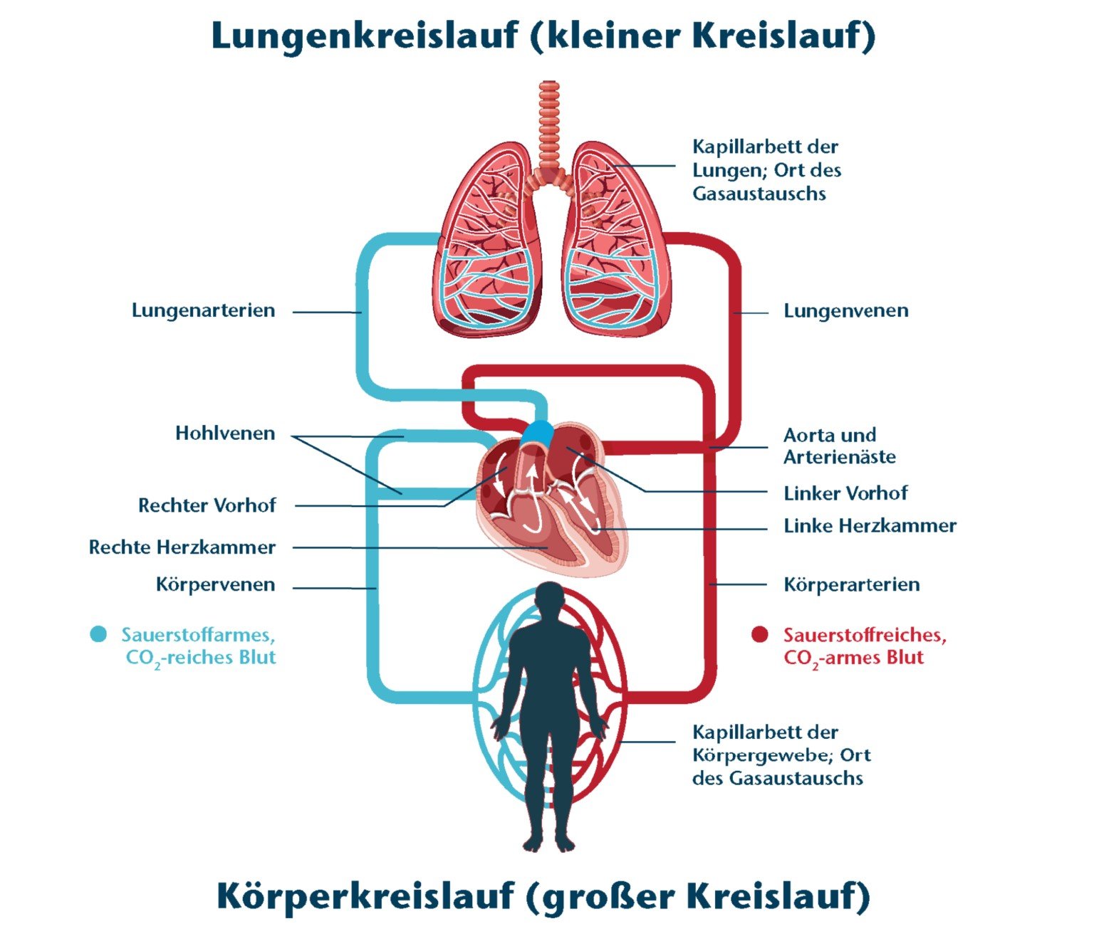Der menschliche Körper besitzt zwei hintereinander geschaltete Blutkreisläufe, den Körperkreislauf („großer Kreislauf“) und den Lungenkreislauf („kleiner Kreislauf“). Beide Kreisläufe sind über das Herz miteinander verbunden.