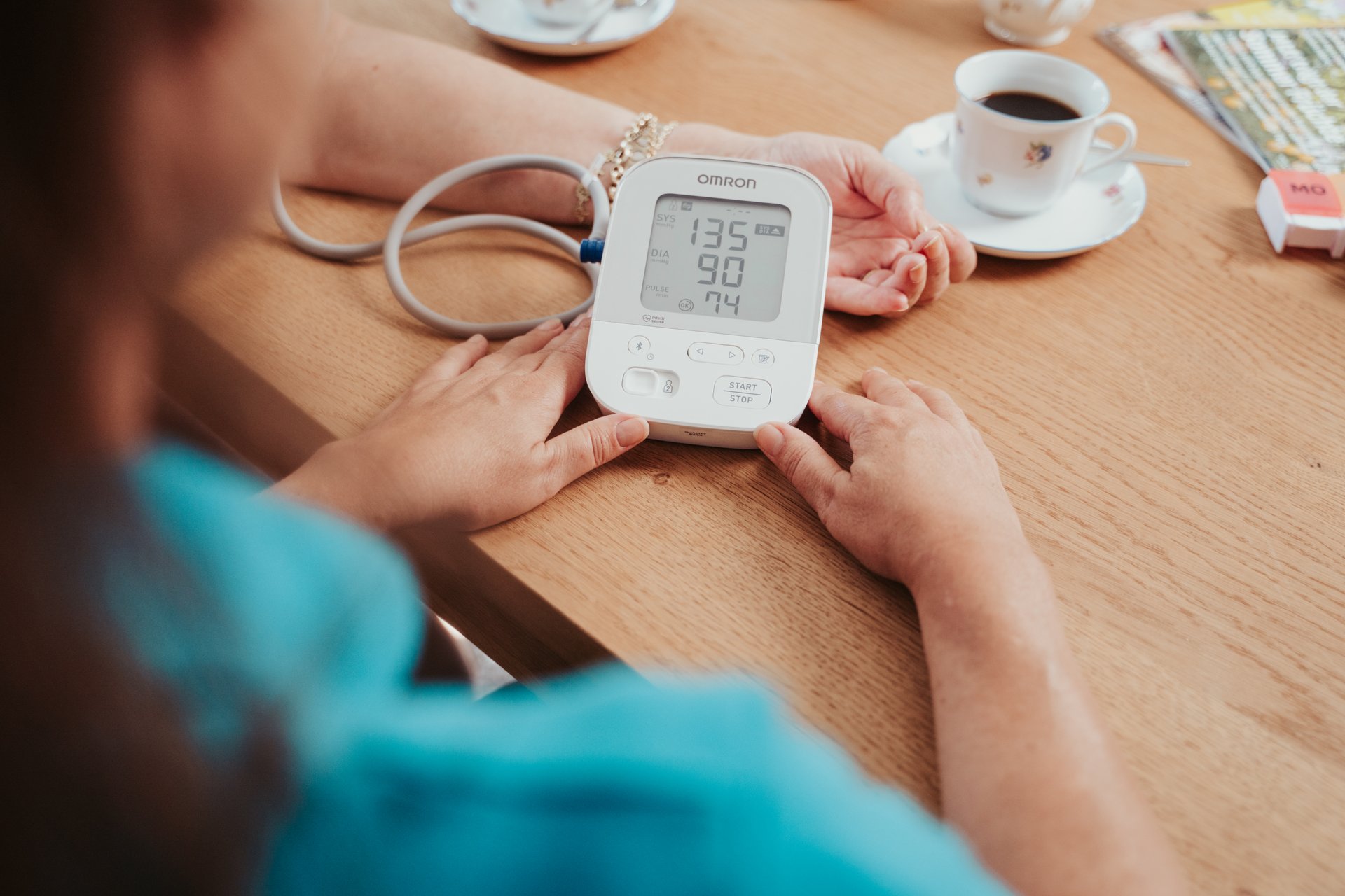 - Armposition: Während der Messung sollte sich die Manschette in Herzhöhe befinden. Ist der Arm zu hoch gelagert, können zu niedrige Messwerte ermittelt werden.