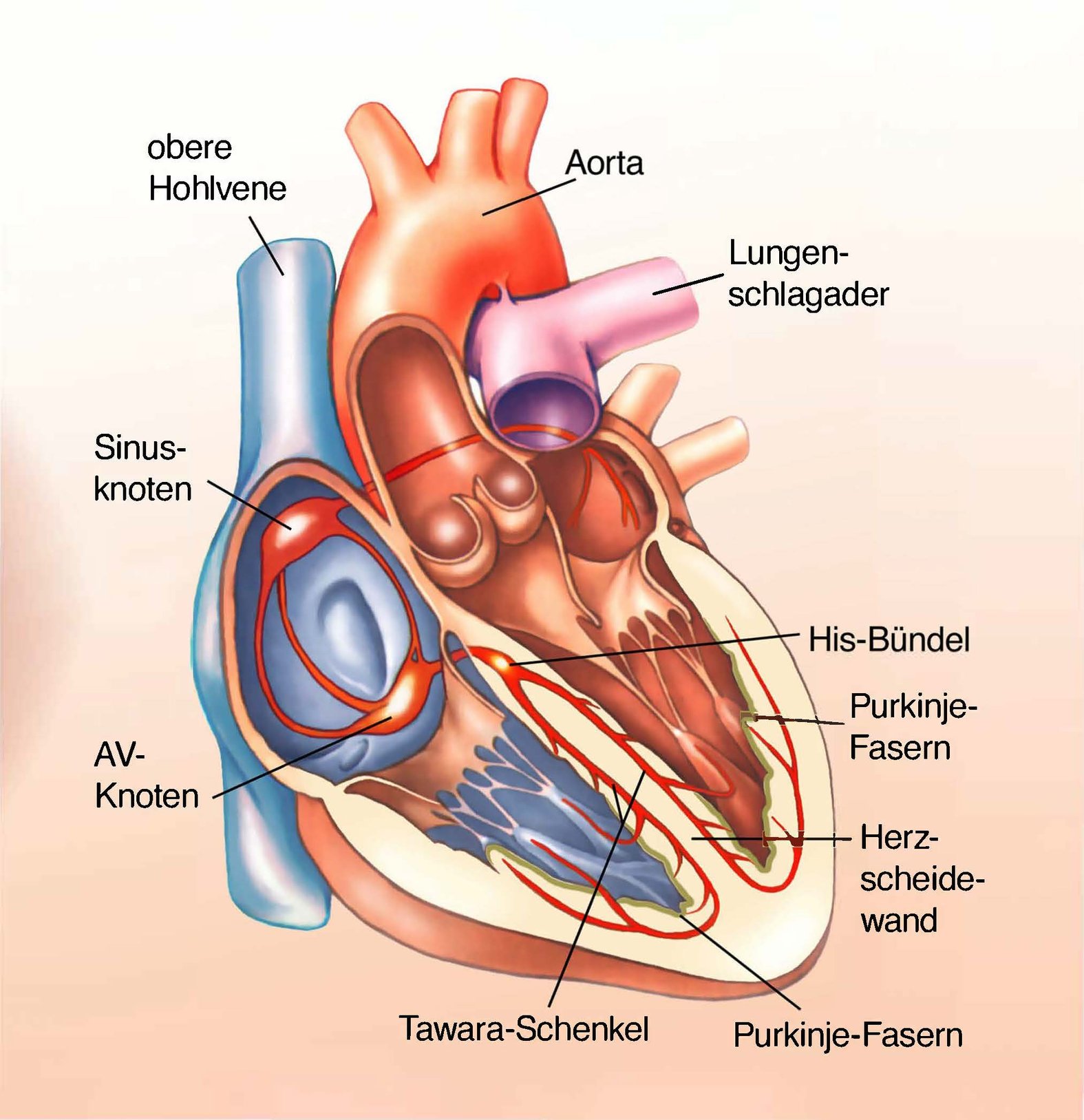 Wie auch jeder andere Muskel im menschlichen Körper benötigt das Herz einen elektrischen Reiz (Impuls) durch einen Nerv, um sich zusammenzuziehen. Ein Erregungsleitungssystem ermöglicht das regelmäßige Schlagen des Herzens. Die Impulsgebung übernimmt der in der Vorderwand des rechten Vorhofs liegende Sinusknoten. Der Sinusknoten bildet einen elektrischen Reiz, der über die Vorhofsmuskulatur zu dem am Boden des Vorhofs liegenden Vorhof-Kammer-Knoten (AV-Knoten) weitergeleitet wird. Vom AV-Knoten über das His-Bündel, Tawara-Schenkel und die Purkinje-Fasern wird die Erregung auf die Muskulatur der Herzkammern übertragen.