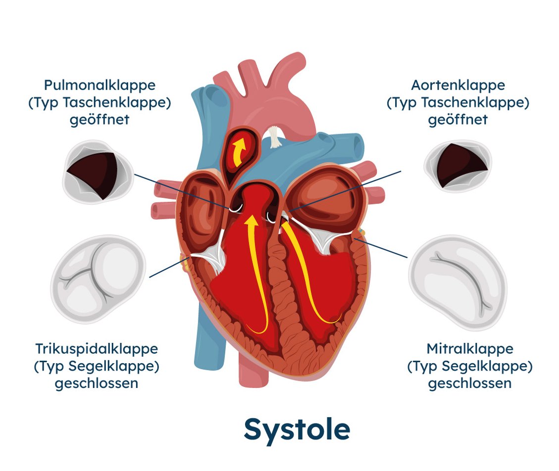Bei einem erwachsenen Menschen schlägt das Herz zwischen 60 und 80 mal in der Minute. Die Herzschläge werden als Puls, z. B. am Handgelenk, gemessen. Ein einzelner Herzschlag, also ein Herzzyklus, besteht aus einer rhythmischen Abfolge von Systole (Kontraktionsphase) und Diastole (Erschlaffungsphase):