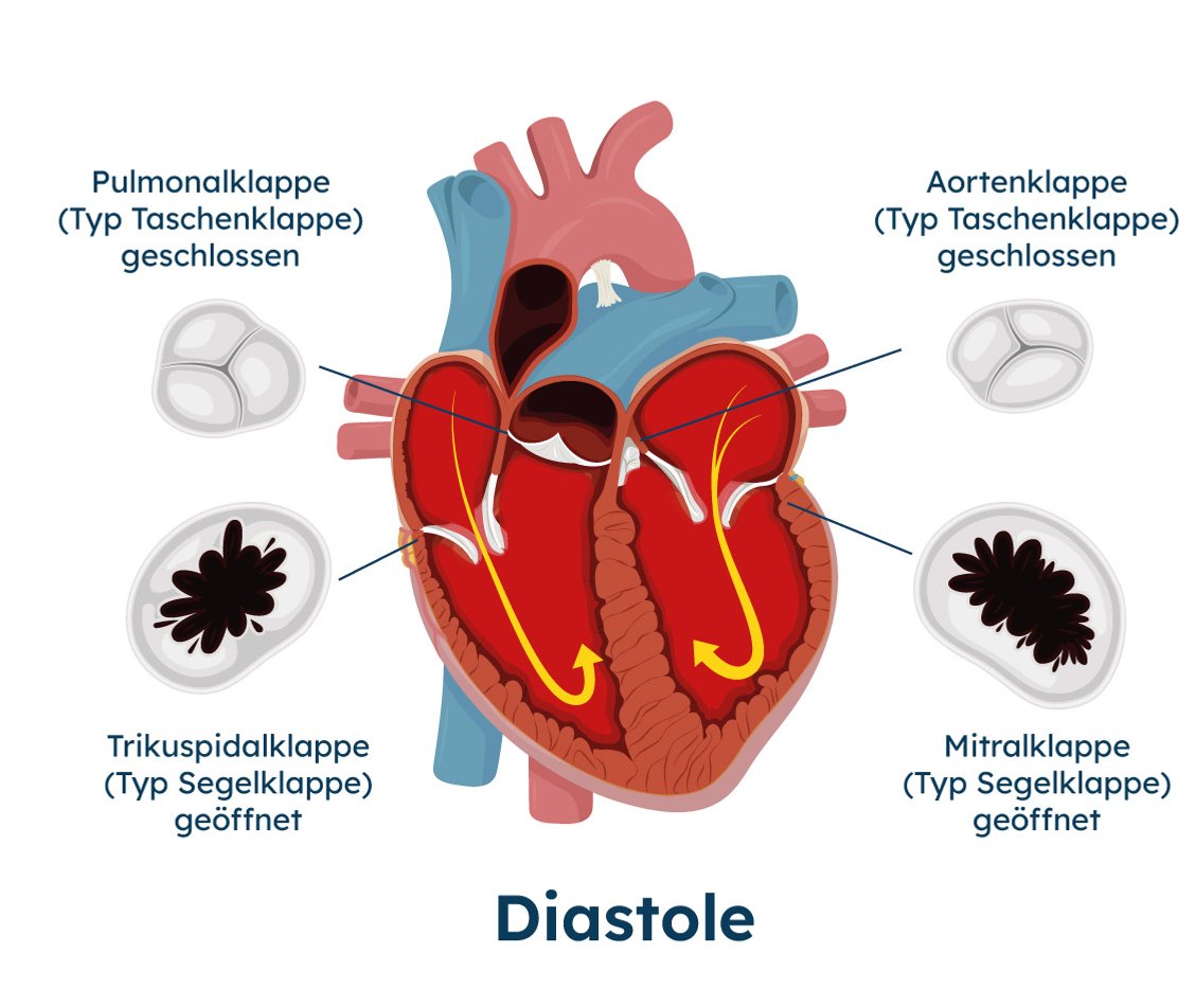 - Füllungsphase: Der Blutdruck in den Vorhöfen steigt. Die Segelklappen öffnen sich und das angestaute Blut strömt aus den Vorhöfen in die Kammern.