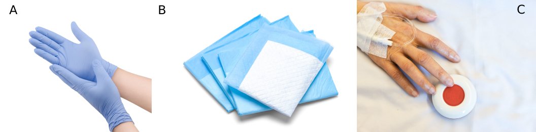Abbildung 2: Pflegehilfsmittel A) Einmalhandschuhe; B) Inkontinenzunterlagen; C) Pflegenotrufsystem