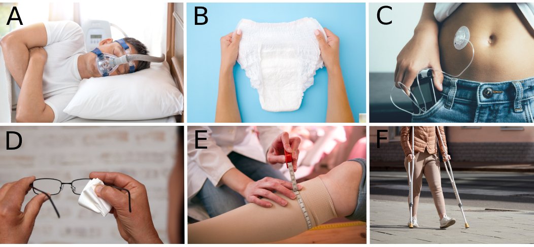Abbildung 1: Hilfsmittel A) CPAP-Gerät; B) Windeln; C) Insulinpumpe; D) Kontaktlinsen oder Brillen; E) Kompressionsleggins; F) Unterarmgehstütze;