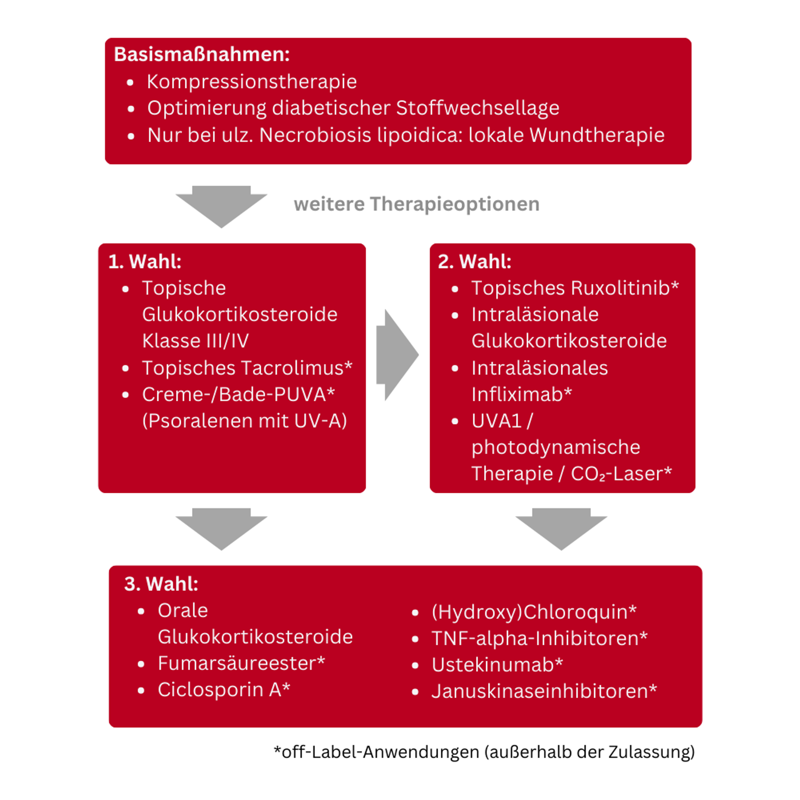 Abb. Klinischer Algorithmus zur Therapie der Necrobiosis lipoidica gemäß aktueller S1-Leitlinie; Anwendungen mit * sind off-label (außerhalb der Zulassung).