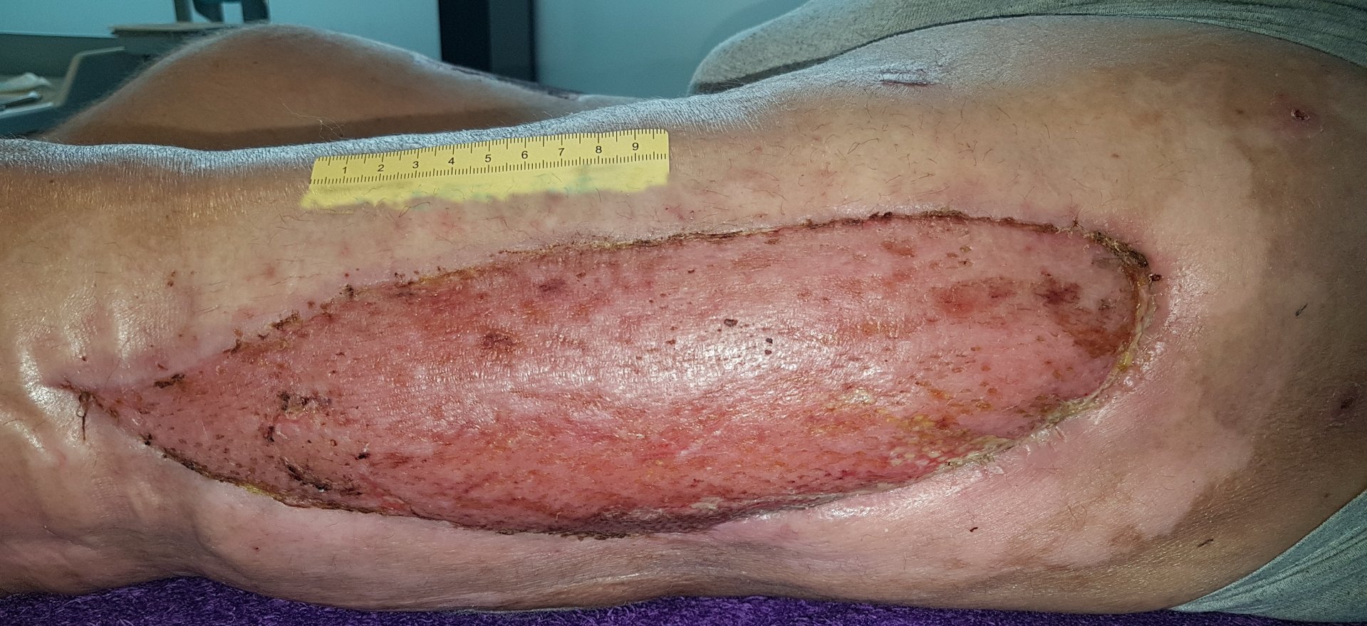 Zunächst erfolgt ein vorübergehender (temporärer) Wundverschluss, da sämtliche Nekrosen und bakterielle Toxine sicher aus dem Gewebe entfernt sein müssen. Für einen temporären Wundverschluss eignen sich Hautersatz-Produkte sowie die Vakuumversiegelungstherapie.