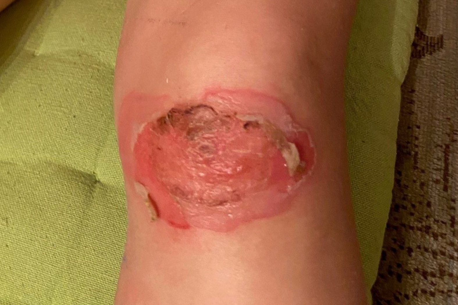 Bild 2: Fallbeispiel einer Schürfwunde mit Rötung und Blasenbildung: keine Allergie, sondern eine Infektion der Wunde