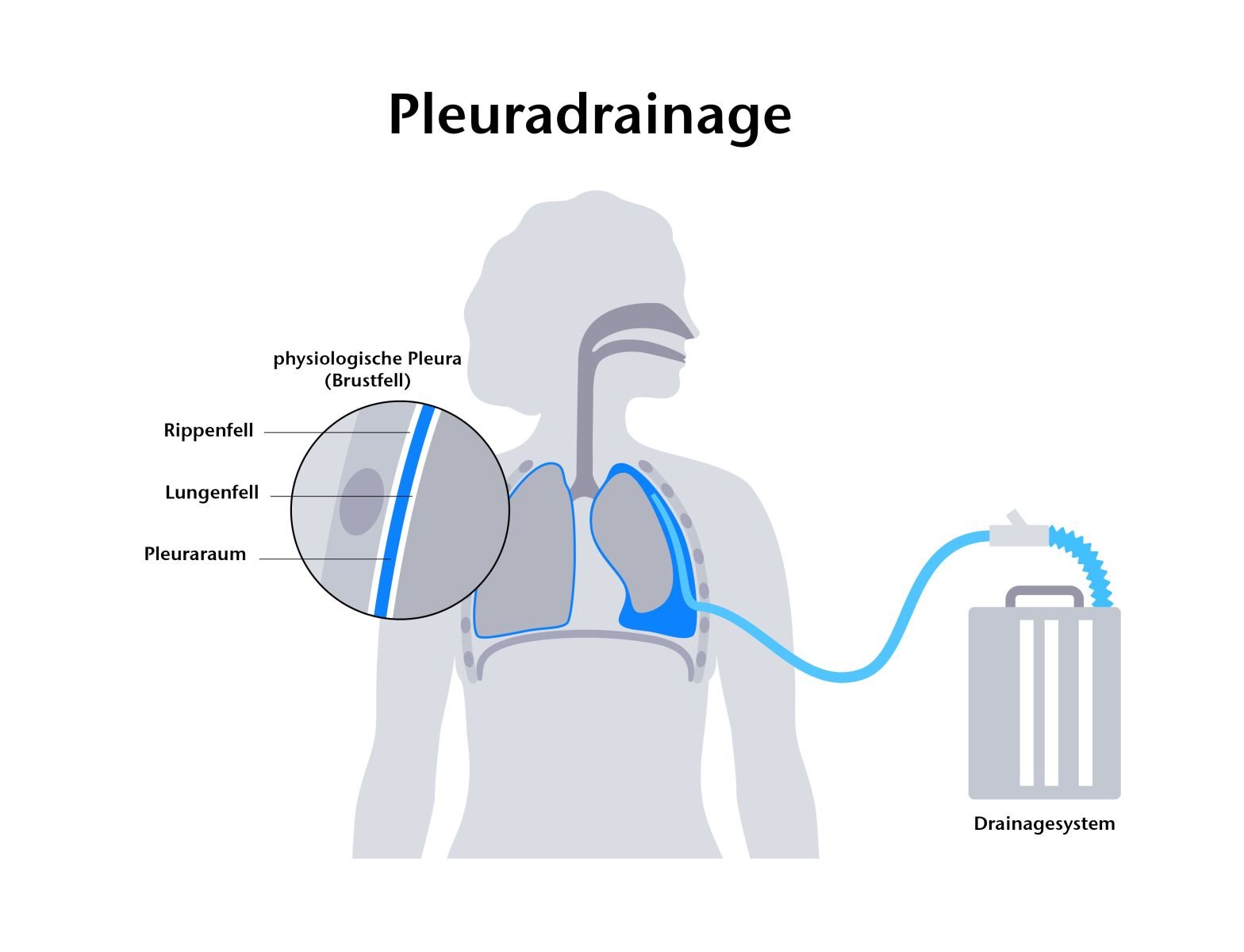 Damit stellt die Pleuradrainage den physiologischen Unterdruck im Pleuraspalt wieder her, der bei Gesunden durch die entgegengesetzten Kräfte von Lunge und Thorax bei der Atmung entsteht. Dieser Unterdruck ist die Voraussetzung dafür, dass die Atemluft ein- und ausströmen kann und damit die Lunge nicht kollabiert. Das heißt, die Pleuradrainage entlastet die Lunge und ermöglicht es ihr, wieder zu expandieren.1