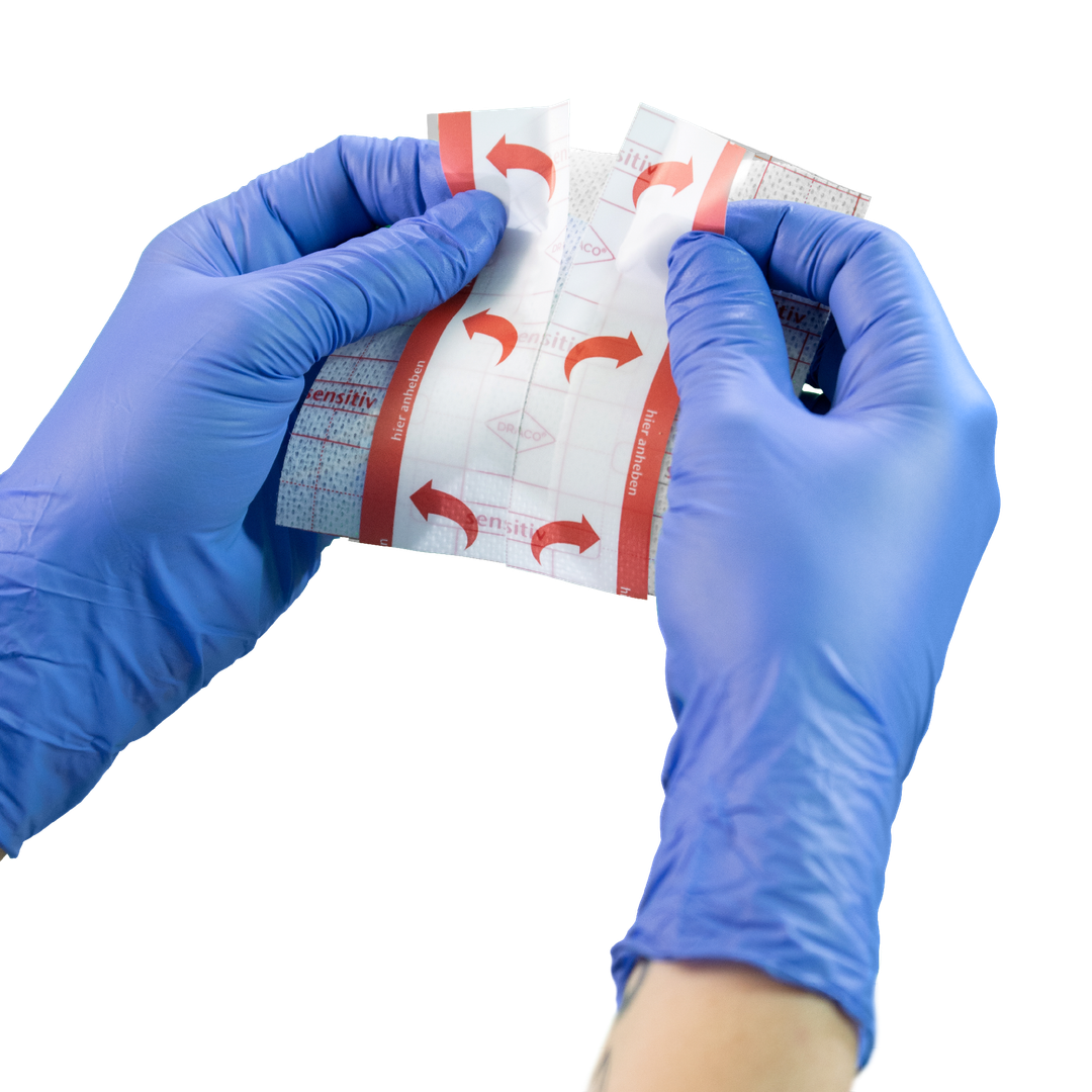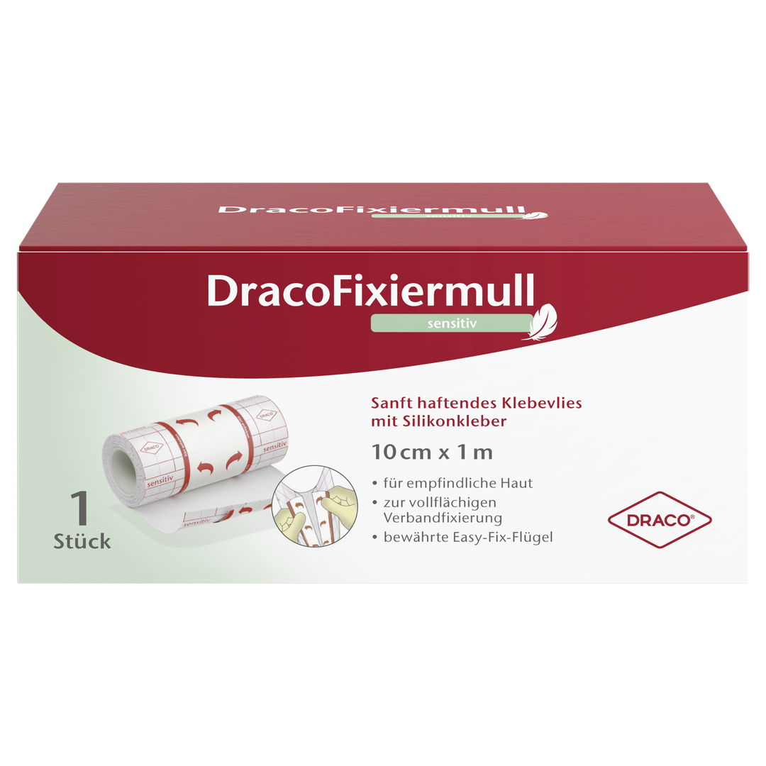 Das weiße Polyestervlies ist luft- und wasserdampfdurchlässig, haftet dabei sicher und sanft dank des hautfreundlichen Silikonklebers. DracoFixiermull sensitiv ist individuell zuschneidbar und dank der Easy-Fix-Flügel wie gewohnt einfach zu applizieren. Es verklebt weder mit sich selbst, noch mit dem Handschuh. Das selbstklebende Verbandvlies ist durch seine Dehnbarkeit und Elastizität optimal geeignet zur Fixierung von Wundauflagen auch an schwierigen Körperstellen.