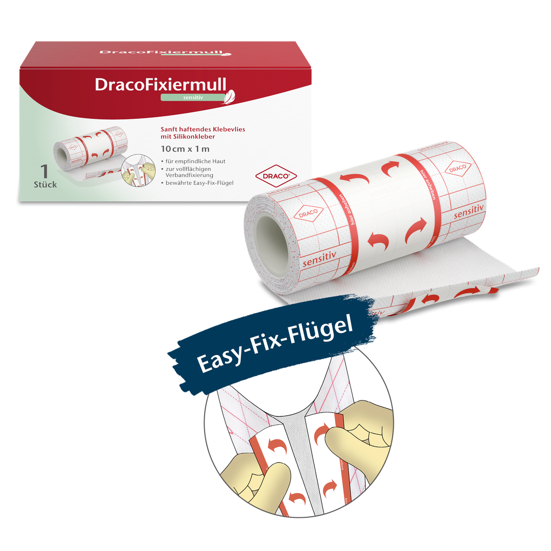 DracoFixiermull sensitiv mit den bewährten Easy-Fix Flügeln ist ein elastisches, sanft haftendes Klebevlies zur vollflächigen Verbandfixierung.