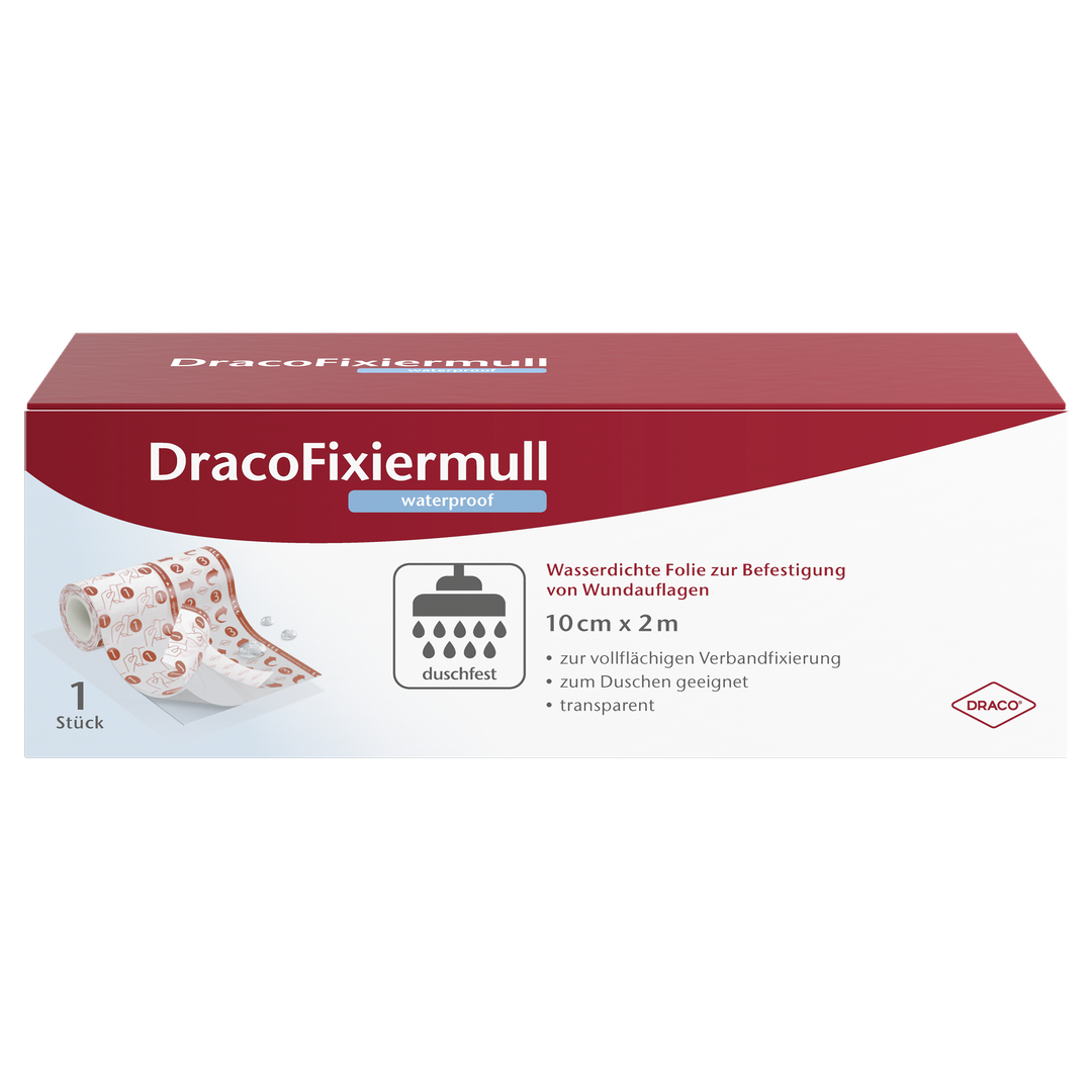 Die Polyurethanfolie ist luft- und wasserdampfdurchlässig, haftet dabei sicher dank des hautfreundlichen Polyacrylatklebers. Darüber hinaus ist DracoFixiermull waterproof bakteriendicht und schützt somit vor Kontaminationen. Es ist individuell zuschneidbar und dank der schrittweisen Anleitung auf der Trägerfolie wie gewohnt einfach zu applizieren. Die dünne selbstklebende Folie ist durch seine Dehnbarkeit und Elastizität optimal geeignet zur Fixierung von Wundauflagen auch an schwierigen Körperstellen, wie bspw. Gelenken. DracoFixiermull waterproof ermöglicht aufgrund der wasserdichten und rutschfesten Verbandfixierungen das Duschen auch ohne zusätzlichen Verbandwechsel.