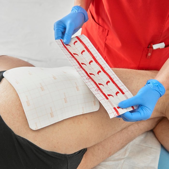 Die wasserabweisende PolyurethanFolie verhindert das Entweichen des Exsudats und stellt eine Barriere gegen Erreger von außen dar. Die Beurteilung der Exsudatsituation wird durch das aufgedruckte Exsudatraster vereinfacht.