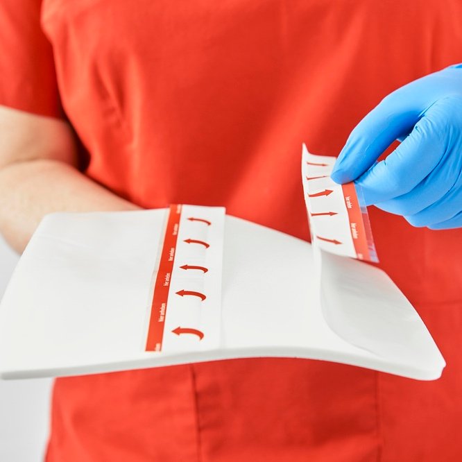 DracoFoam easyfix ist eine Schaumstoffwundauflage mit sanft anhaftenden Silikonstreifen zur Versorgung von Wunden mit hohem Exsudataufkommen. Durch die Silikonstreifen verrutscht die Wundauflage nicht, sie sind wie eine „3. Hand“, und man hat beide Hände für die Fixierung frei. Die Silikonstreifen sollten nur nicht auf der Wunde platziert werden.
