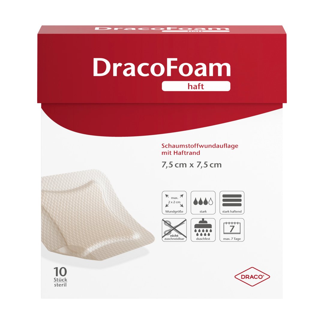 DracoFoam haft ist geeignet für Wunden mit hohem Exsudataufkommen, z. B. oberflächliche und tiefere akute und chronische Wunden wie Ulcus cruris (venös, arteriell), Dekubitus oder diabetisches Fußsyndrom, Spalthautentnahmestellen, postoperative Wunden und Verbrennungen bis zum 2. Grad. Die Schaumstoffwundauflage gewährleistet atraumatischen Verbandwechsel und verhindert das Einsprießen des Gewebes in die Wundauflage.
