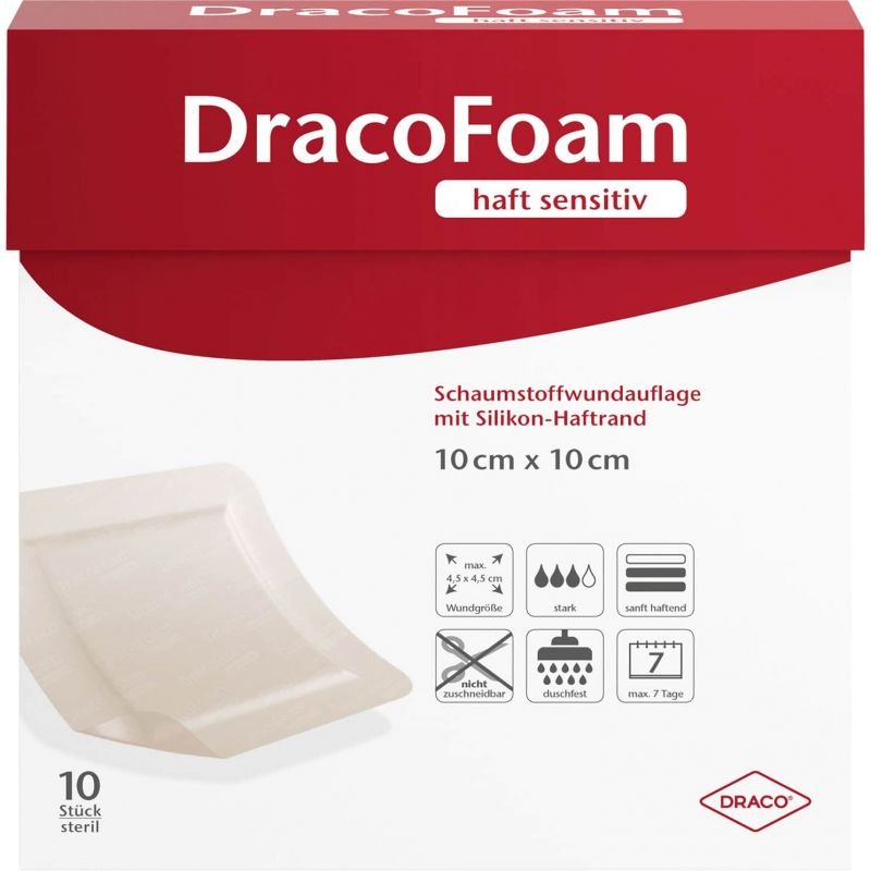 DracoFoam haft sensitiv ist eine sterile hydrophile Polyurethanschaumstoffwundauflage zur Abdeckung akuter und chronischer Wunden, zur Aufnahme und Speicherung von Wundexsudat sowie zur Erhaltung eines feuchten Wundmilieus. Der flexible Polyurethan-Schaum wölbt sich in der Anwendung dem Wundgrund entgegen und besitzt ein hohes Exsudataufnahmevermögen. Das gute Exsudatmanagement ermöglicht eine lange Tragedauer und vermindert die Gefahr von Wundmazeration. Die überschüssige Flüssigkeit wird zur Polyurethan-Membran transportiert, sodass diese dort abdampfen kann. Die Polyurethan-Folie verhindert das Entweichen des Exsudats und stellt eine Barriere gegen Erreger von außen dar.