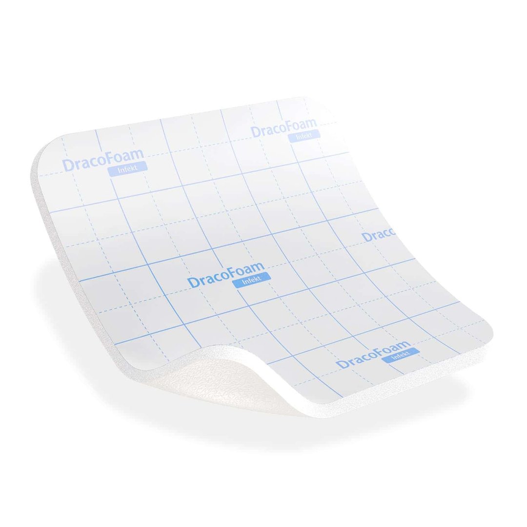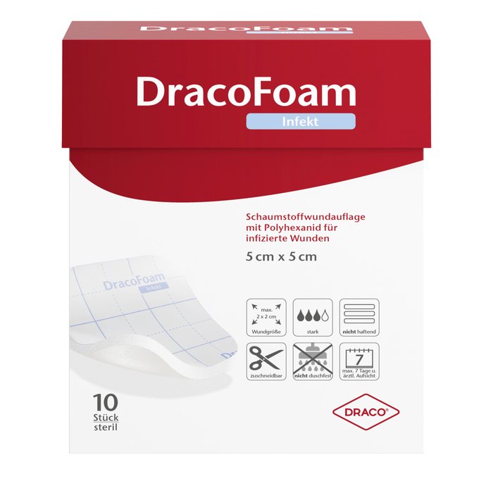 DracoFoam Infekt ist eine sterile hydrophile Polyurethanschaumstoffwundauflage zur Abdeckung akuter und chronischer Wunden, zur Aufnahme und Speicherung von Wundexsudat sowie zur Erhaltung eines feuchten Wundmilieus. Der flexible Polyurethan-Schaum wölbt sich in der Anwendung dem Wundgrund entgegen und besitzt ein hohes Exsudataufnahmevermögen. Die überschüssige Flüssigkeit wird zur Polyurethan-Membran transportiert, sodass diese dort abdampfen kann. Die Polyurethan-Folie verhindert das Entweichen des Exsudats und stellt eine Barriere gegen Erreger von außen dar.