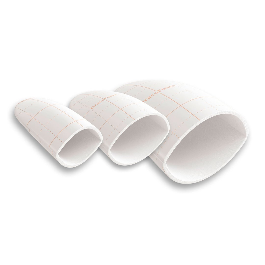 Die DracoFoam Zehenkappe ist eine sterile hydrophile Polyurethanschaumstoffwundauflage zur Abdeckung akuter und chronischer Wunden, zur Aufnahme und Speicherung von Wundexsudat sowie zur Erhaltung eines feuchten Wundmilieus. Der flexible Polyurethan-Schaum wölbt sich in der Anwendung dem Wundgrund entgegen und besitzt ein gutes Exsudataufnahmevermögen. Die überschüssige Flüssigkeit wird zur Polyurethan-Membran transportiert, sodass diese dort abdampfen kann. Die Polyurethan-Folie verhindert das Entweichen des Exsudats und stellt eine Barriere gegen Erreger von außen dar. Das aufgedruckte Exsudatraster vereinfacht die Beurteilung der Exsudatmenge.