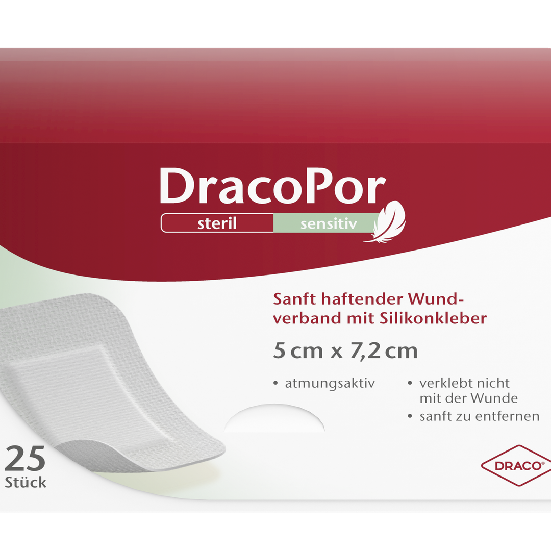 DracoPor sensitiv ist ein steriler atmungsaktiver Wundverband für akute Wunden, zur Versorgung von Schürf- und Schnittwunden sowie postoperativen Wunden. Das atmungsaktive, sterile Pflaster mit nicht verklebendem Wundkissen schützt zuverlässig die Wunde vor äußeren Einflüssen. Die zuverlässige und sanfte Haftung auf der Wundumgebungshaut wird durch einen hypoallergenen Silikon-Kleber gewährleistet und sorgt für eine sanfte und sichere Haftung des sterilen Wundverbandes. DracoPor sensitiv ist schmerzarm zu entfernen und minimiert Hautirritationen selbst bei fragiler Haut.