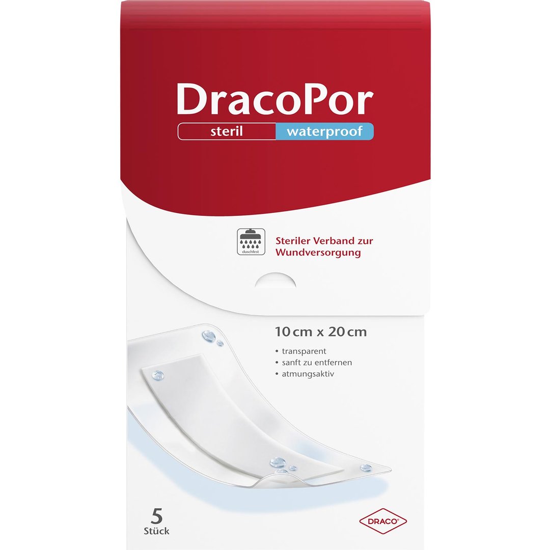 DracoPor Waterproof ist ein steriles Duschpflaster. In 7 Größen von 3,8 cm x 3,8 cm bis 10 cm x 20 cm schützt es akute Wunden, postoperative Wunden, Schürf- und Schnittwunden zuverlässig vor äußeren Einflüssen bei Wasserkontakt.