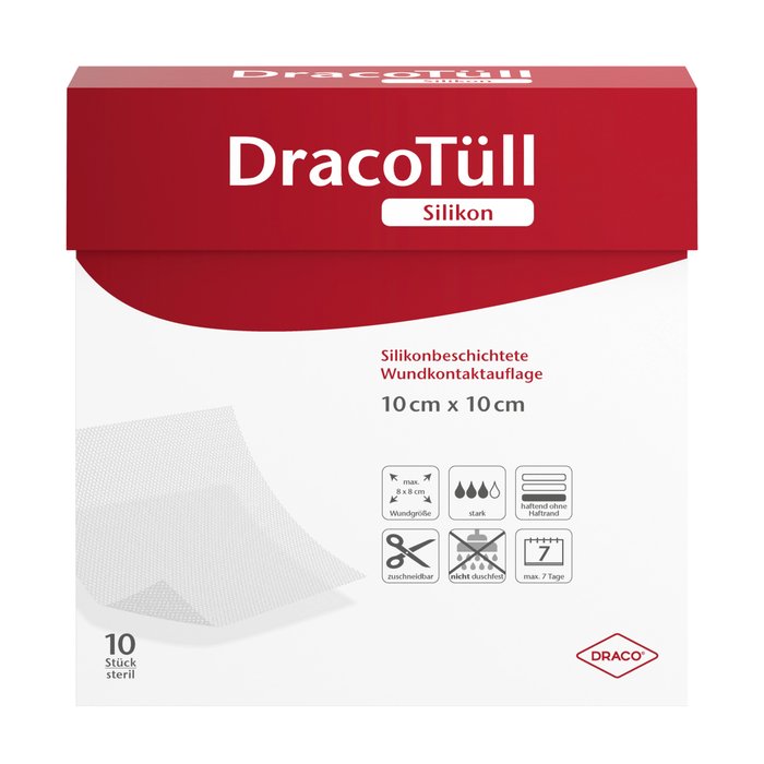 Es ist für schwach bis stark exsudierende Wunden geeignet, die eine kombinierte Versorgung benötigen, z. B. oberflächliche akute und chronische Wunden wie Ulcus cruris (venös, arteriell), Dekubitus oder diabetisches Fußsyndrom, Spalthautentnahmestellen, postoperative Wunden und Verbrennungen bis zum 2. Grad. Auch bei nicht-exsudierenden Wunden, Schürfwunden, empfindlicher oder Pergamenthaut bietet DracoTüll Silikon einen sehr guten Schutz vor Sekundärverletzungen der Wunde und/oder Wundumgebungshaut.