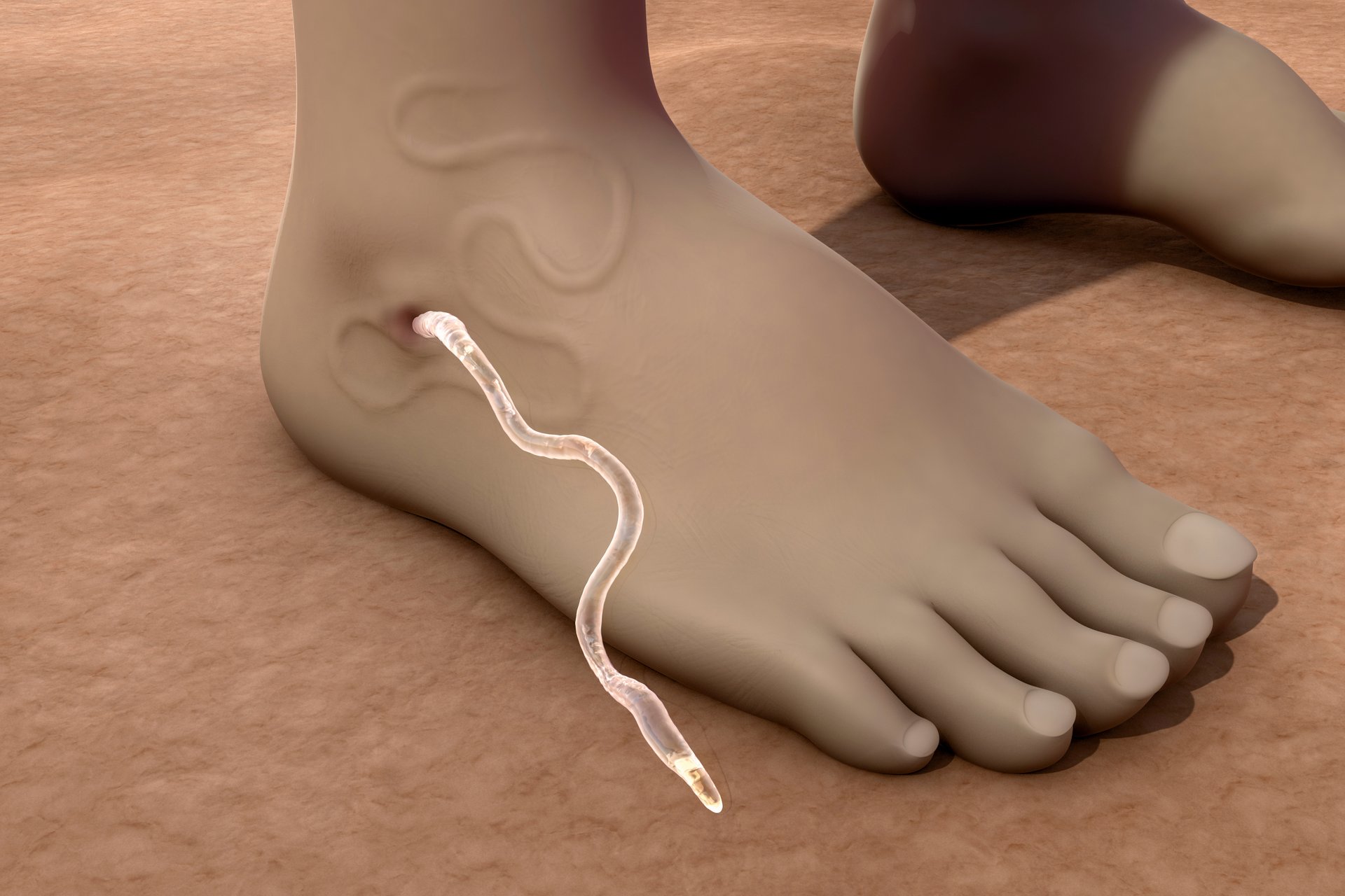 Die Dracontiasis ist eine Infektion, die durch den Fadenwurm Dracunculus medinensis, auch Medina- oder Guineawurm genannt, ausgelöst wird. Die Erkrankung wird durch das Eindringen von infizierten Krustentieren in den Körper verursacht. Die Krustentiere beherbergen Larven des Guineawurms. Wenn Menschen Wasser trinken, das mit infizierten Krustentieren verunreinigt ist, schlucken sie auch die Larven des Wurms. Im Körper schlüpfen die Larven aus den Eiern und wandern durch das Gewebe, um sich zu erwachsenen Fadenwürmern zu entwickeln. Die erwachsenen Guineawürmer sind bis zu einen Meter lang und leben in der Unterhaut, insbesondere in den Beinen.