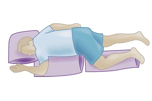 Hilfsmittel zur Dekubitus-ProphylaxeImmobile, liegende Menschen müssen durch Fachkräfte und/oder Zugehörige so positioniert werden, dass der Sakraldekubitus frei liegt und keinem Druck ausgesetzt ist. Um die Entstehung von Druckstellen zu vermeiden, muss die Position spätestens alle zwei Stunden verändert werden. Bei einem Dekubitus in der Gesäßregion ist die sogenannte 135°-Lagerung ratsam, bei der die Person beinahe in Bauchlage liegt. Für die 135°-Lagerung werden zwei Kissen benötigt, die jeweils auf einer Seite unter den Oberkörper und die entsprechende Unterkörperhälfte gelegt werden.