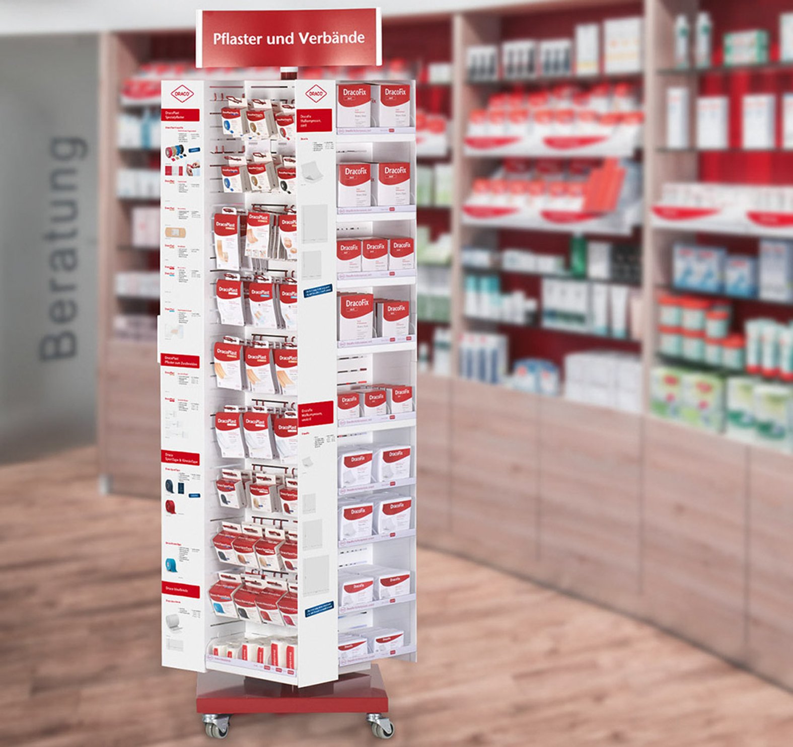 Der Aufsteller beinhaltet mit 489 Packungen unser Pflastersortiment und unsere Tapes, Mullkompressen, sterile Wundverbände sowie Fixier- und Idealbinden – kompakt und übersichtlich! Die seitlich angebrachten Fühlmuster unterstützen Beratungsgespräche und bieten dem Endverbraucher weitere Informationen. Bisher wurden bereits über 5.000 Wund-Kompetenz-Center verkauft.