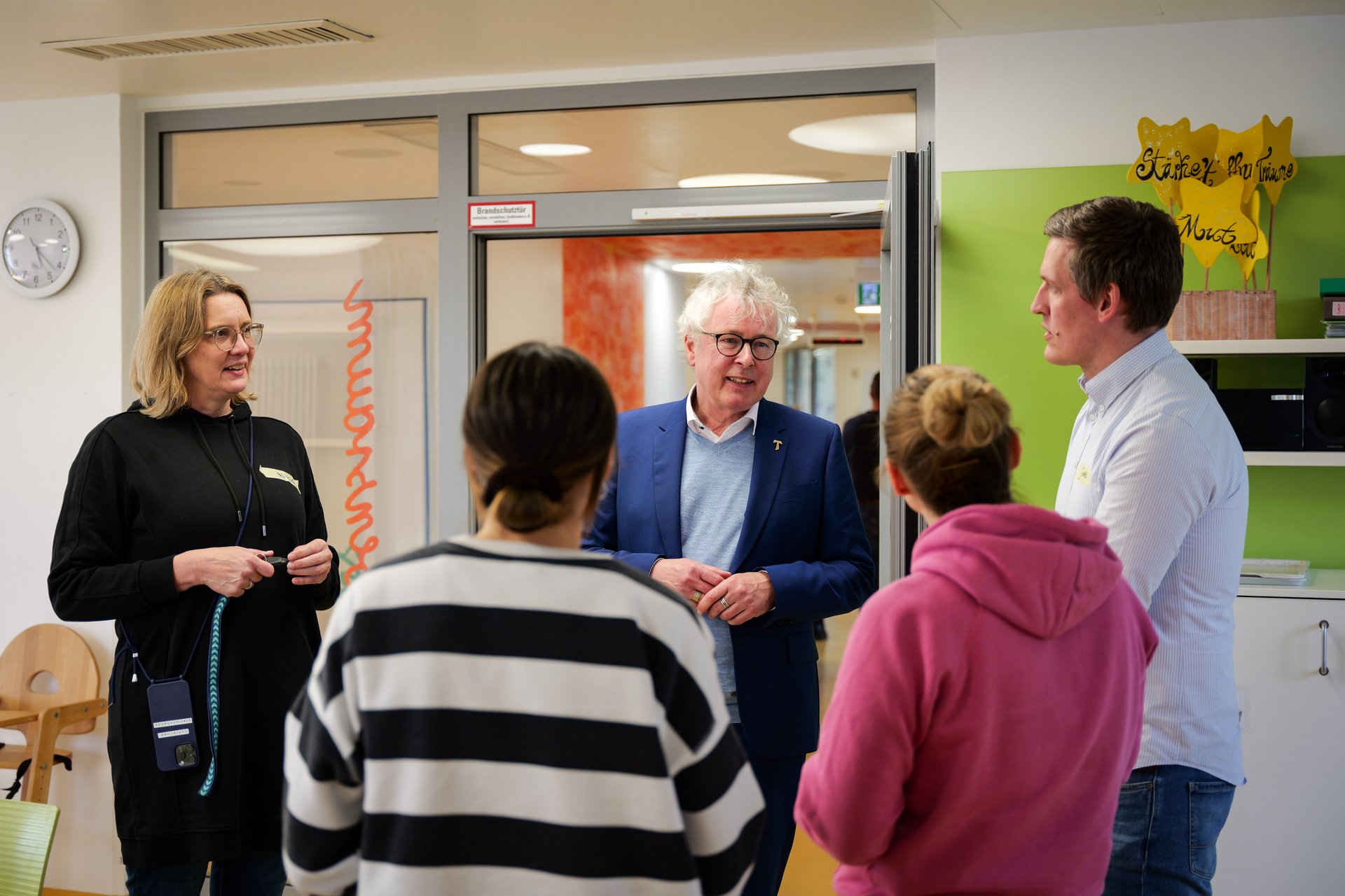 An diesem Tag wurde aber nicht nur gekocht. Bei Gesprächen und einer Führung lernten die Teilnehmerinnen und Teilnehmer des Einsatzes die Station Lichtblicke näher kennen. Hier gibt es neben liebevoll eingerichteten Patientenzimmern beispielsweise auch einen Snoezelraum, ein Aquarium und viele weitere Details, die den betroffenen Kindern und ihren Familien keine sterile Krankenhausatmosphäre, sondern ein Zuhause auf Zeit bieten. „Es war eine unbeschreiblich positive, ruhige und schöne Atmosphäre.”, beschreibt Jannis seinen Eindruck der Station. Die Gespräche stimmten ihn aber auch nachdenklich. So ging es beispielsweise um die Herausforderungen mehrstündiger Verbandswechsel in der Badewanne bei EB-Patienten (Epidermolysis bullosa), aber auch um Bodenständigkeit und den großen Respekt gegenüber den Familien. Besonders beeindruckt haben ihn aber die positive Einstellung und die bewundernswerte Haltung der Mitarbeiterinnen der Station: „Die Stunden hier haben gezeigt, wie viel man mit großen und kleinen Dingen bewegen und gestalten kann und was es für andere bedeuten kann, Halt zu geben und Haltung zu leben.”, so Jannis weiter.