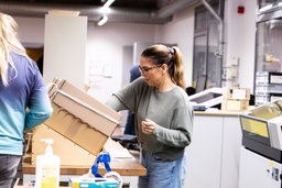 Stefanie Schäfer (Referentin Online Marketing) hilft in der Werkstatt Gottessegen bei dem Verpacken.