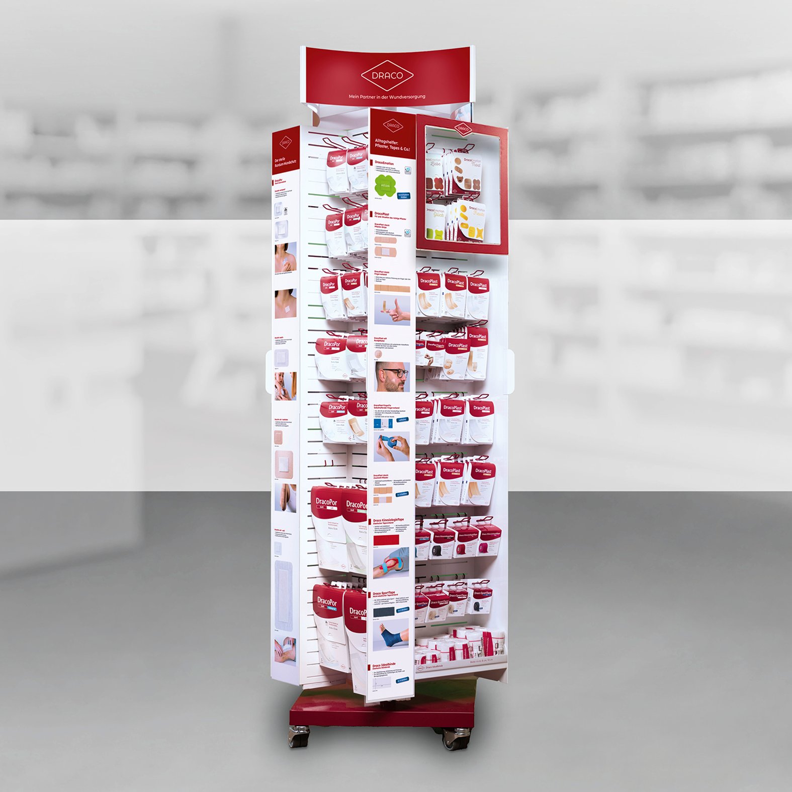 Der Aufsteller bietet Platz für 514 Packungen unseres Pflastersortiments, unserer Tapes, Mullkompressen, sterilen Wundverbände sowie Fixier- und Idealbinden – kompakt und übersichtlich! Die seitlich angebrachten Fühlmuster unterstützen Beratungsgespräche und bieten dem Endverbraucher weitere Informationen.