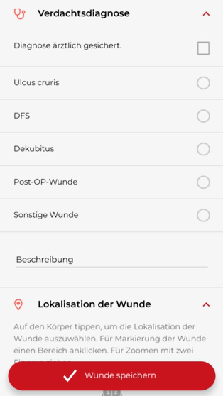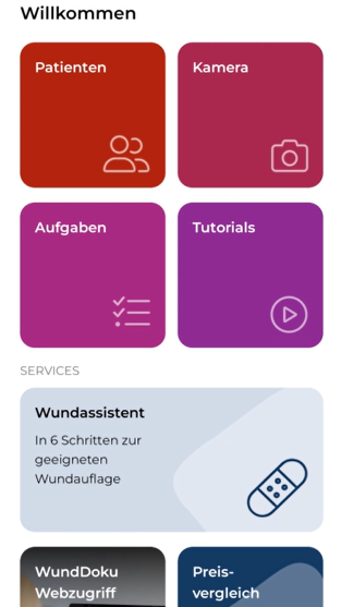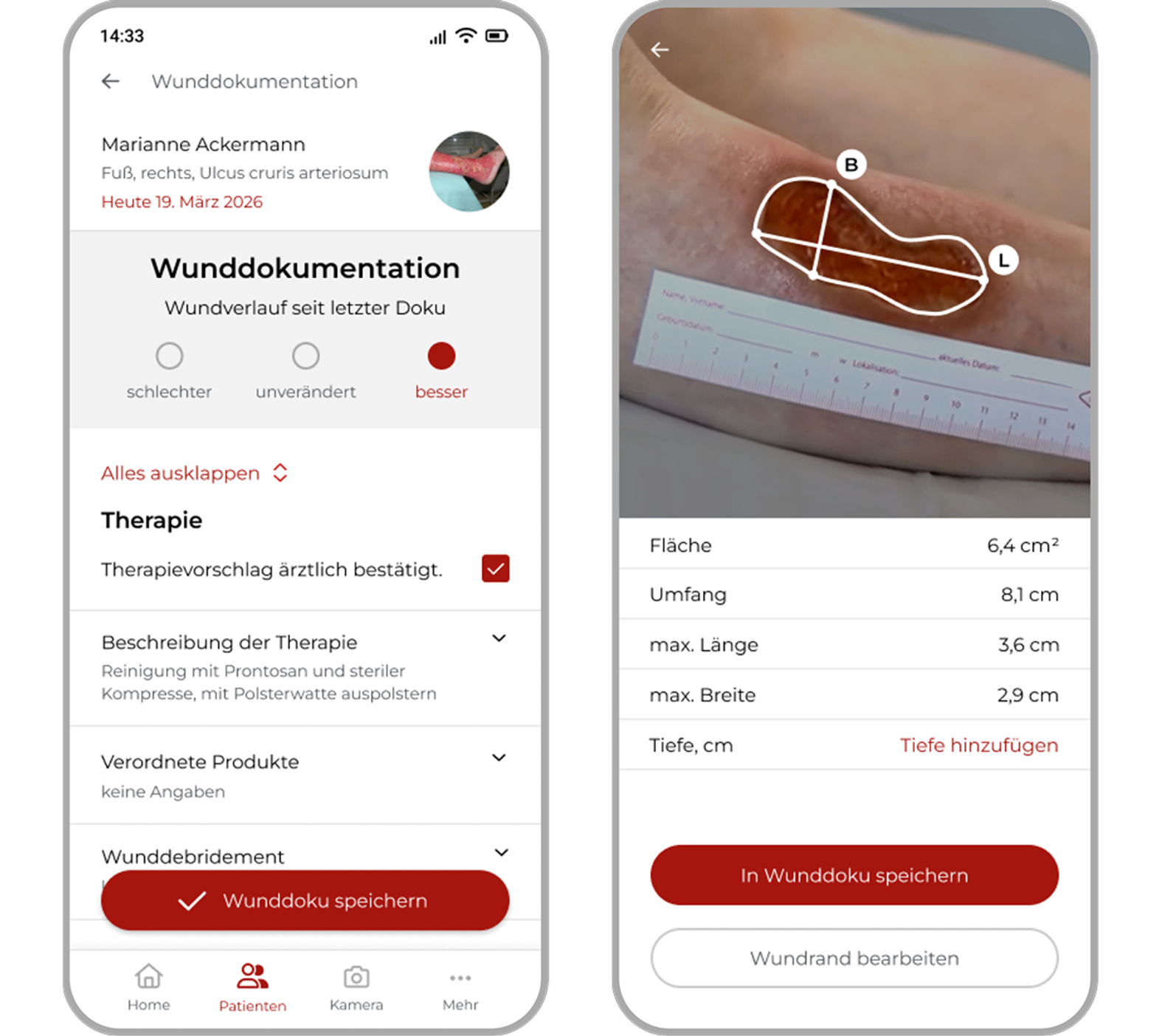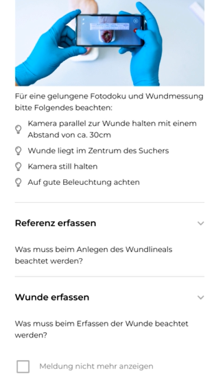 - Wundfotos aufnehmen: Aufnahmen von Wundfotos in der App unterstützen bei der Verfolgung des Wundverlaufs