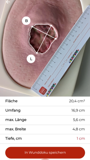 - Automatische Wundvermessung: Wunden mit angelegtem Lineal fotografieren und direkt automatisch vermessen lassen