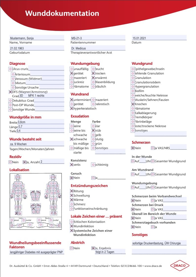 Ausgefülltes Muster: Wunddokumentation der nebenstehenden Wunde.